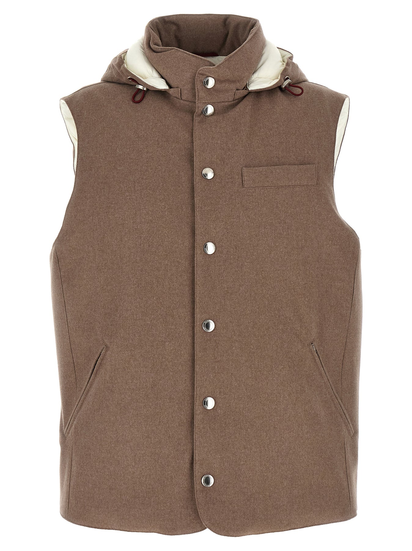 Water-repellent wool vest, quilted nylon lining with goose down padding, adjustable and removable hood, high neck, front snap button closure, pockets.