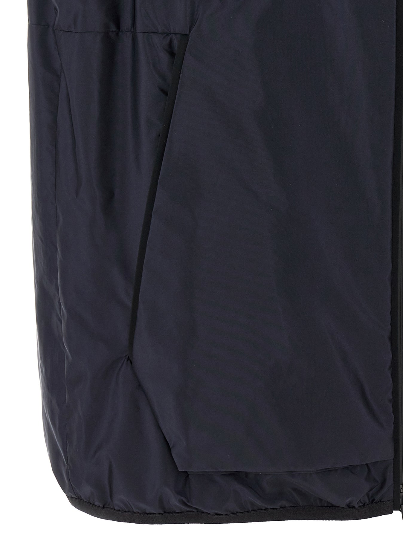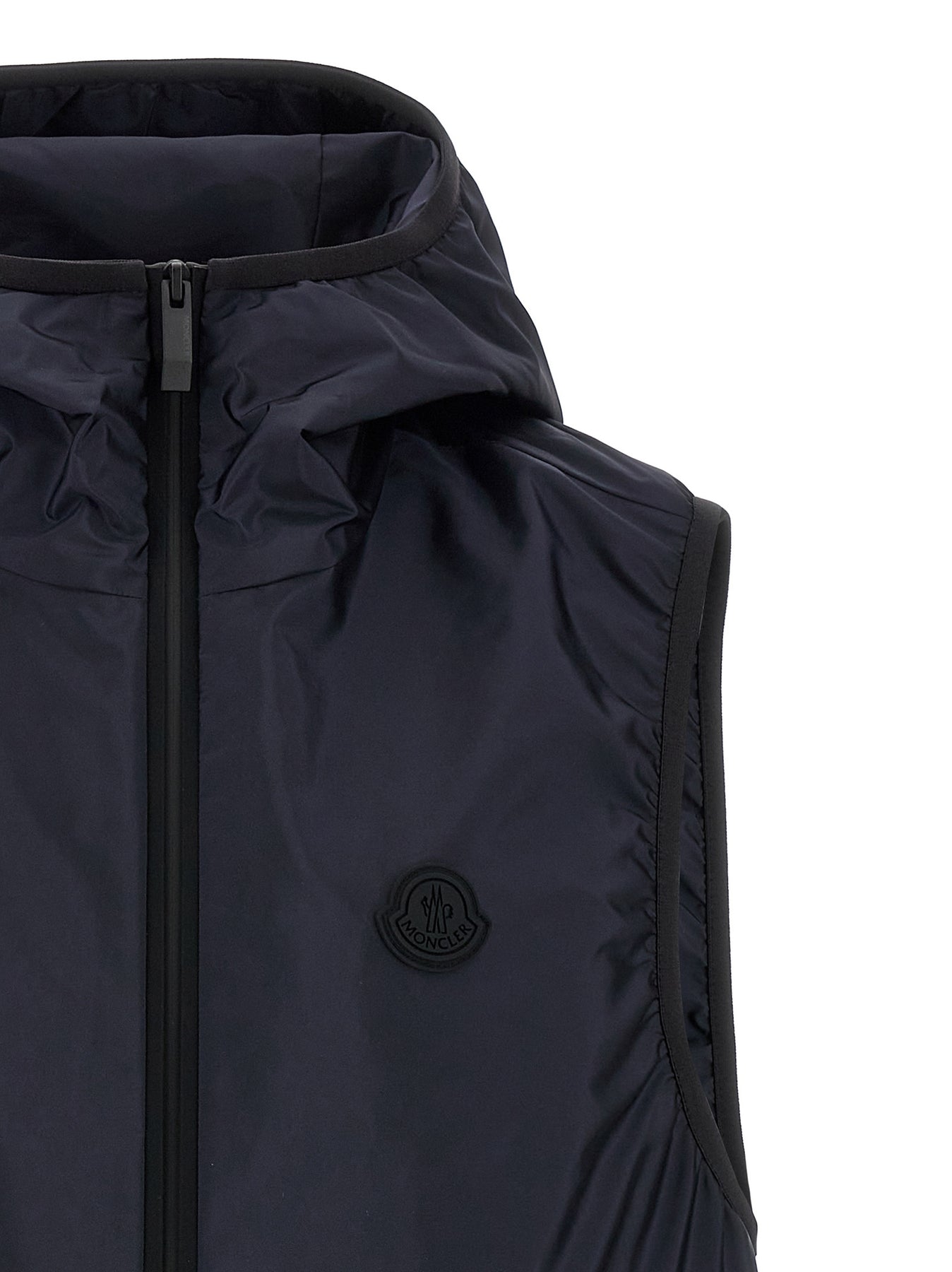 'Moretan' waistcoat in technical nylon with front silicone logo patch, hood with back logo print, front zip closure, pockets.