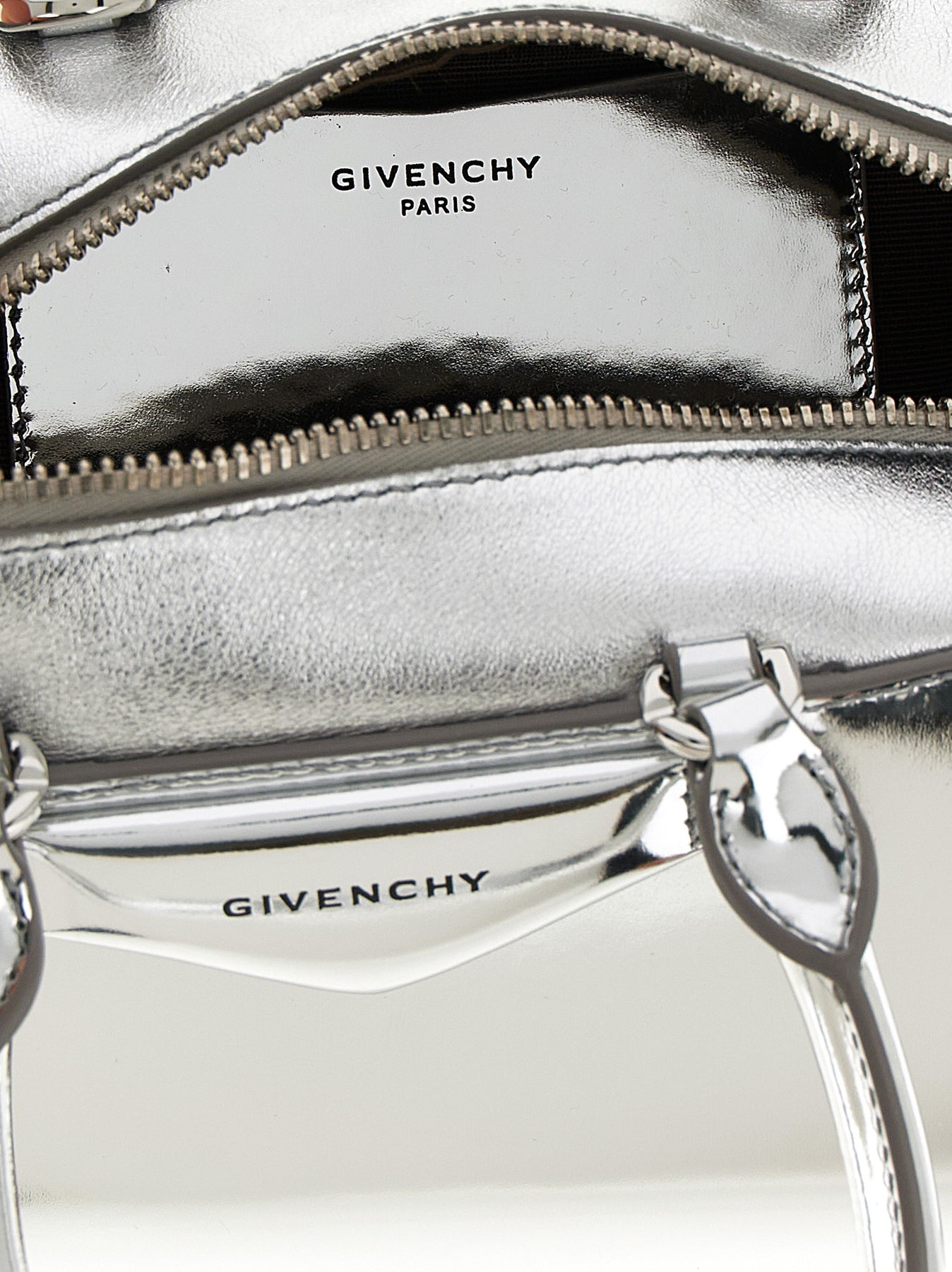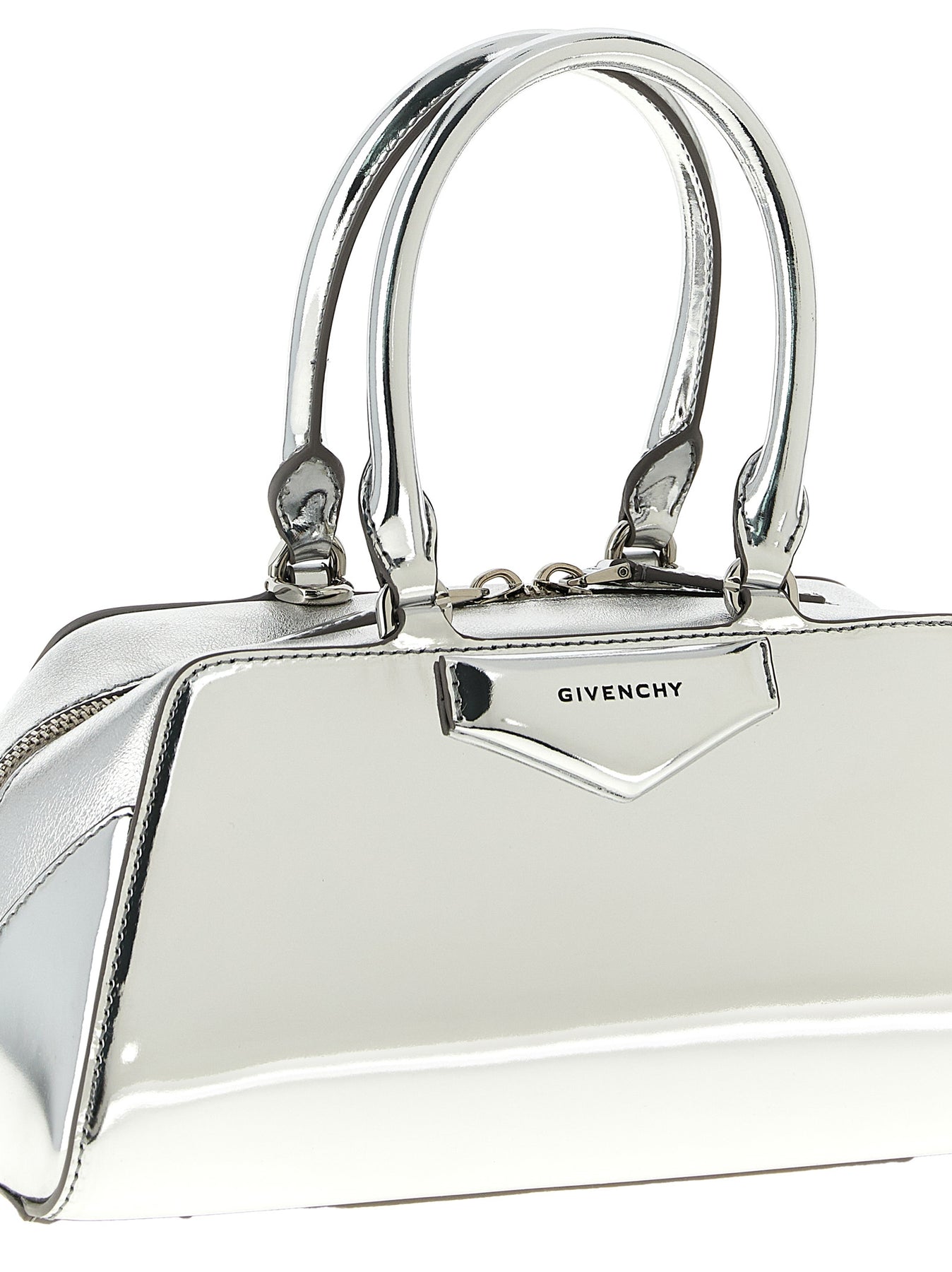 Small 'Antigona East-West' handbag in mirror-effect laminated calf leather and shiny full-grained leather, 'Antigona Cube' line, long East-West shape with origami style gusset structure, tone-on-tone patch with embossed logo, top zip closure, double fixed handle, rigid base, adjustable and removable shoulder strap.