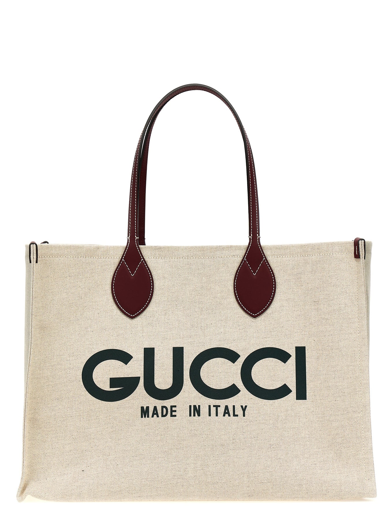 'Gucci' canvas shopping bag with front logo print, leather details, double handle, internal clutch.