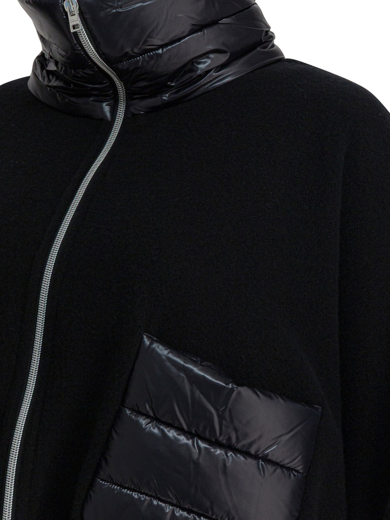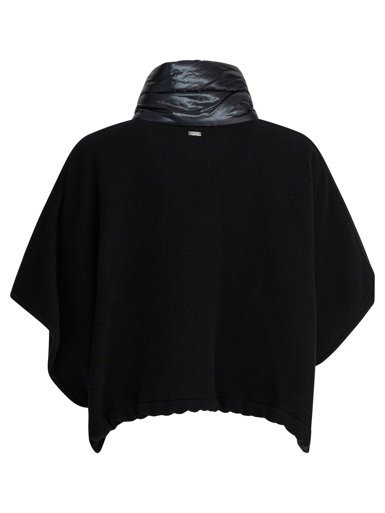 Herno's wool and cashmere "Resort" poncho features a soft, compact construction with down inserts arranged in panels on the body. The high padded collar offers added protection and defines the short, linear silhouette. The sleeves are wide, with a construction without marked seams, while the front pockets remain open and integrated into the essential line of the garment. Full-length front zipper closure. || - Solid color - Down inserts - High padded collar - Zipper closure - Wide sleeves - Open front pockets - Wool and cashmere for soft texture - Regular fit