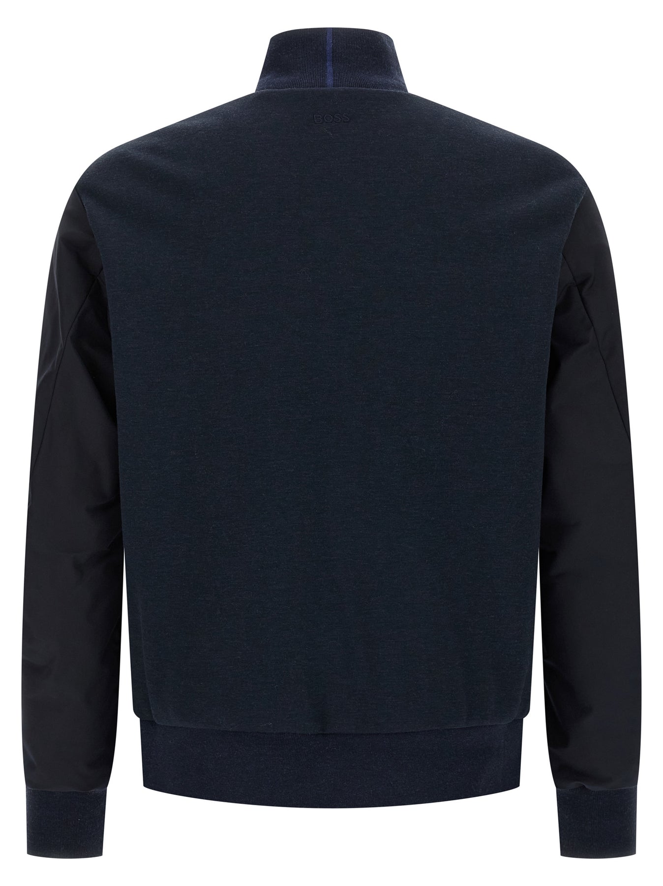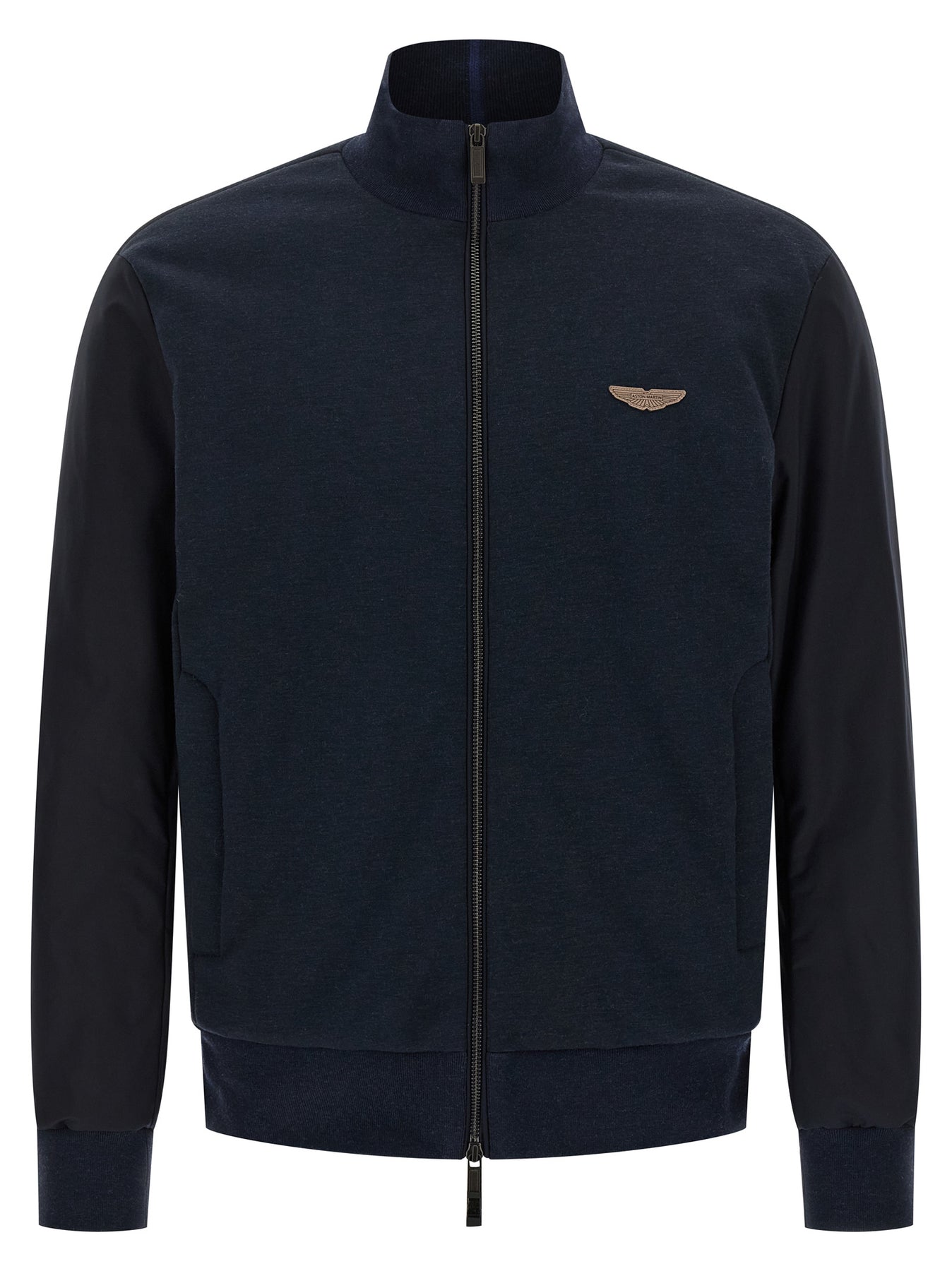 BOSS x Aston Martin 'Shepherd 242' bomber jacket in viscose and wool blend mélange with tone-on-tone nylon sleeves and stretch ribbed knit details, slightly padded nylon lining, logo patch and front zip closure, high neck, pockets, long cuffed sleeves, and headband.