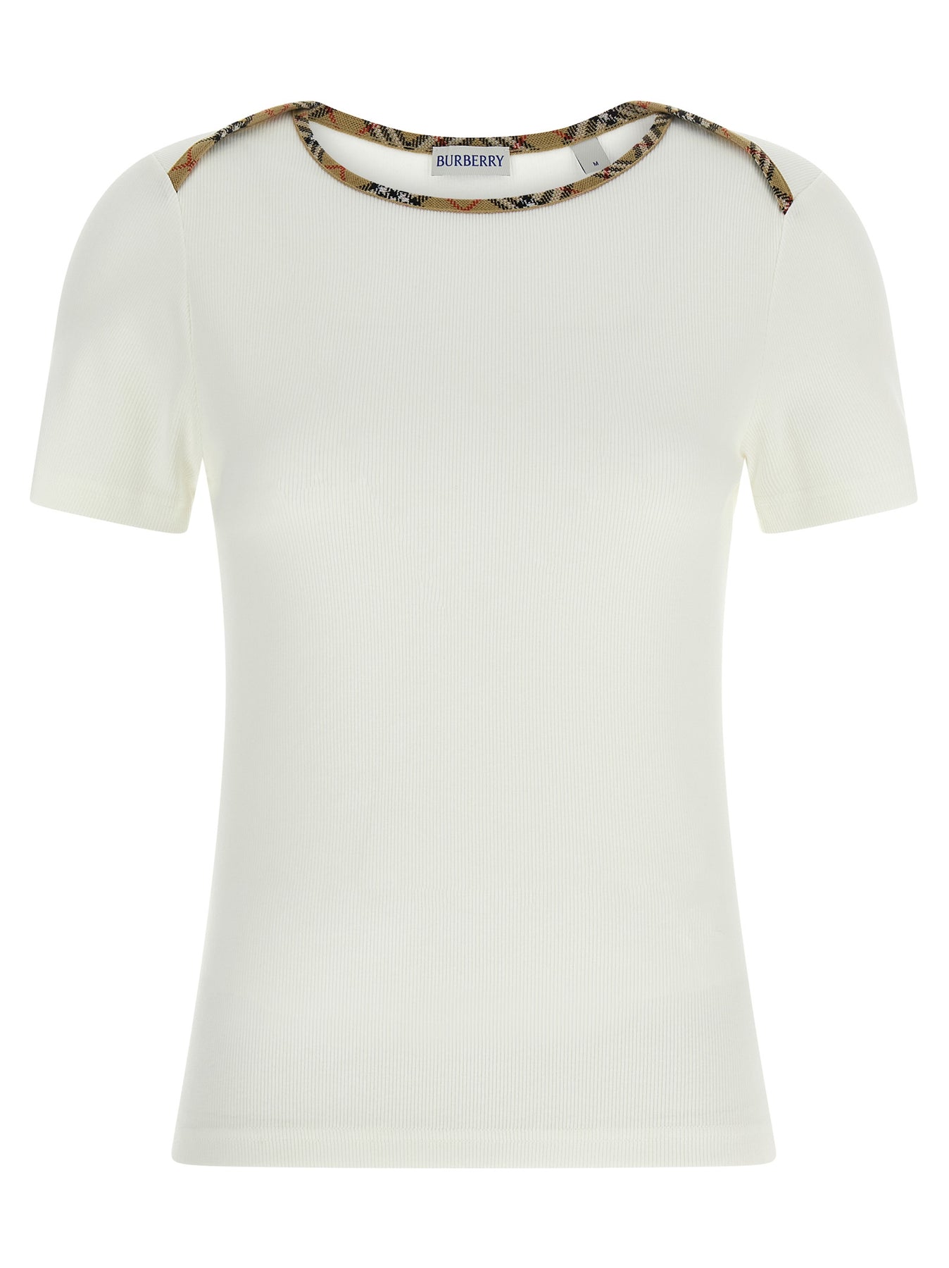 'Stephanie' ribbed stretch cotton jersey t-shirt with collar and shoulders with envelope opening and Burberry Check intarsia, tone-on-tone 'Equestrian Knight Design' embroidery on the front, short sleeves.