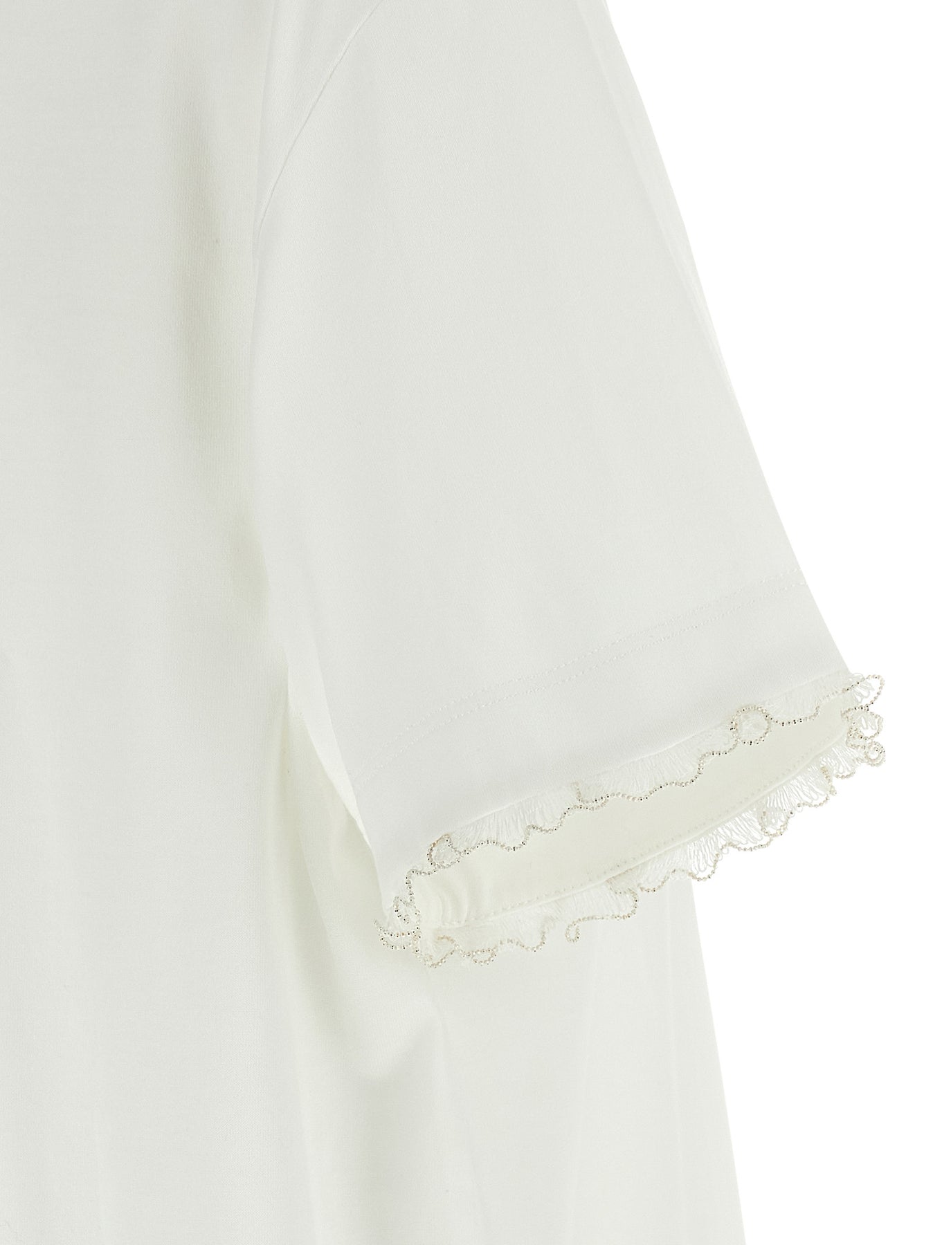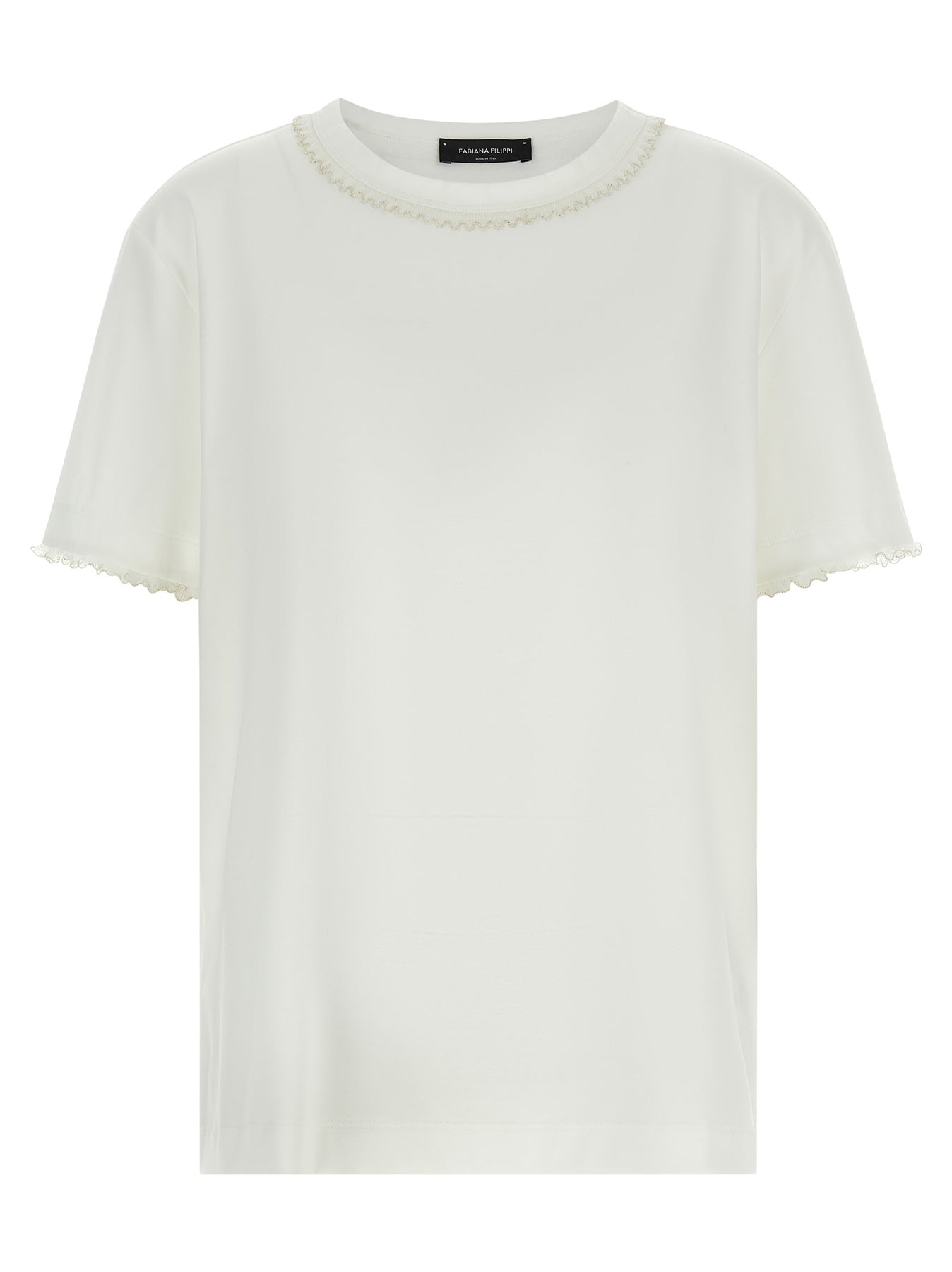 T-shirt in cotton jersey, crew neck, straight cut, embroidery detail with beads on the neck and sleeves.