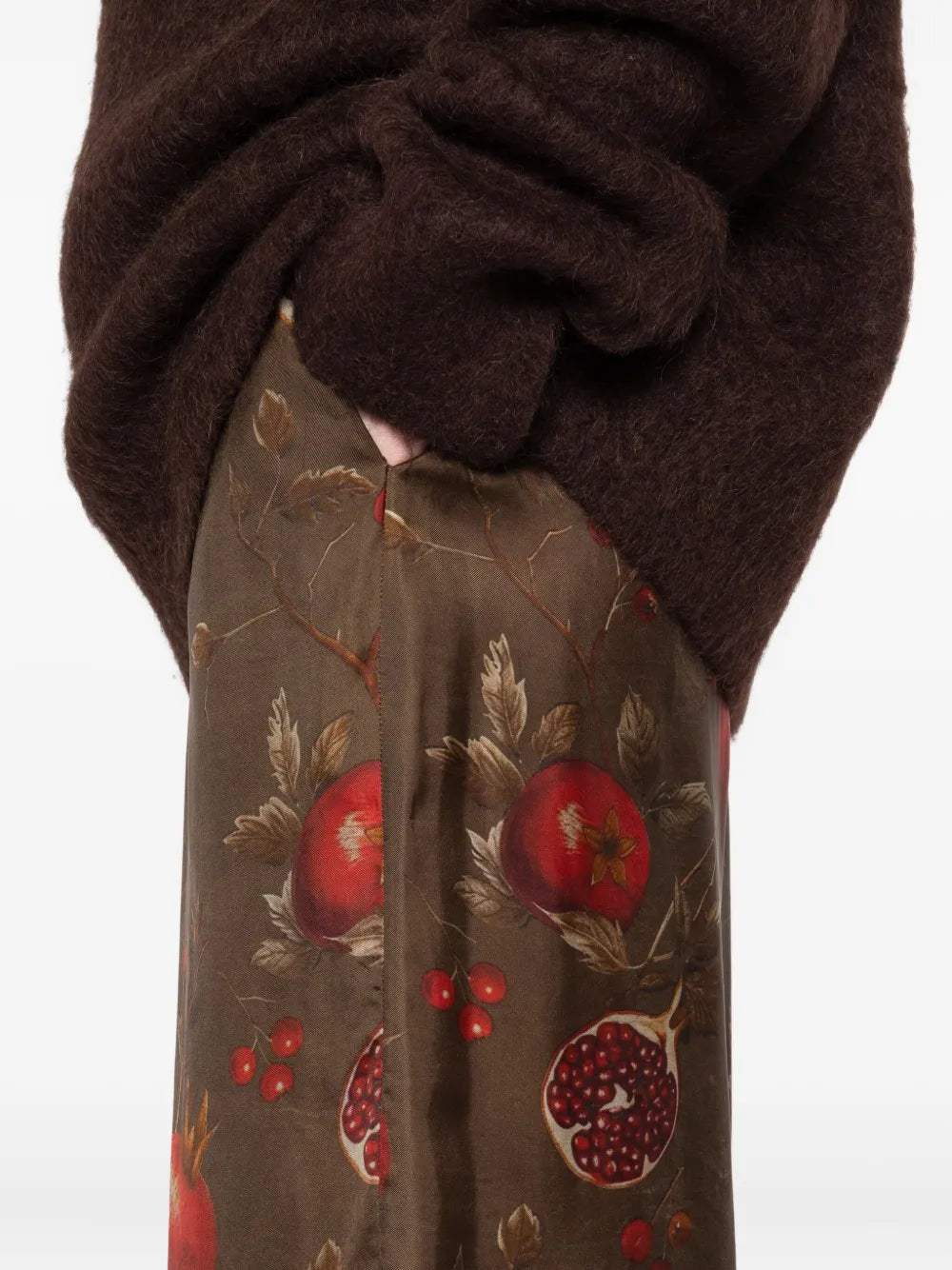 Pomegranate Print Pants Origin: Italy Features Brown Pomegranate print Elastic waist High waist Straight hem Composition 50% viscose, 50% cupro Washing Instructions Hand wash ID UP3001