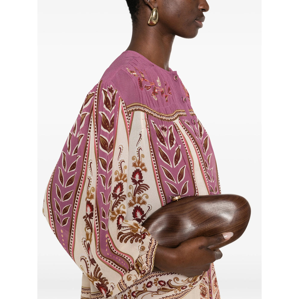 purple floral print embroidered detailing button fastening round neck long sleeves