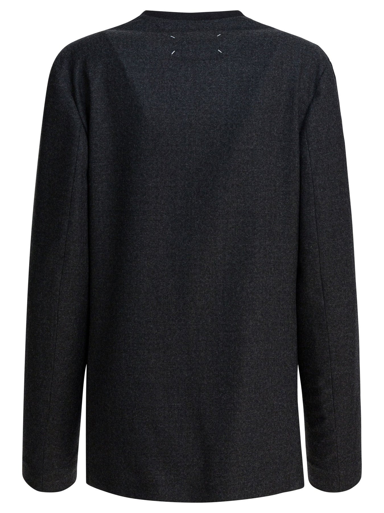 Maison Margiela virgin wool blazer features a collarless cut and minimal construction with an open front. The structure features sharp lines and a clean silhouette, with a relaxed fit that maintains essential geometry. The main fabric, virgin wool, offers firm texture and dry feel. Four visible topstitches, a distinctive element of the Maison, are applied on the back. || - Made from virgin wool - Collarless - Front without fastening - Four applied topstitching on the back - Long sleeves - Regular fit