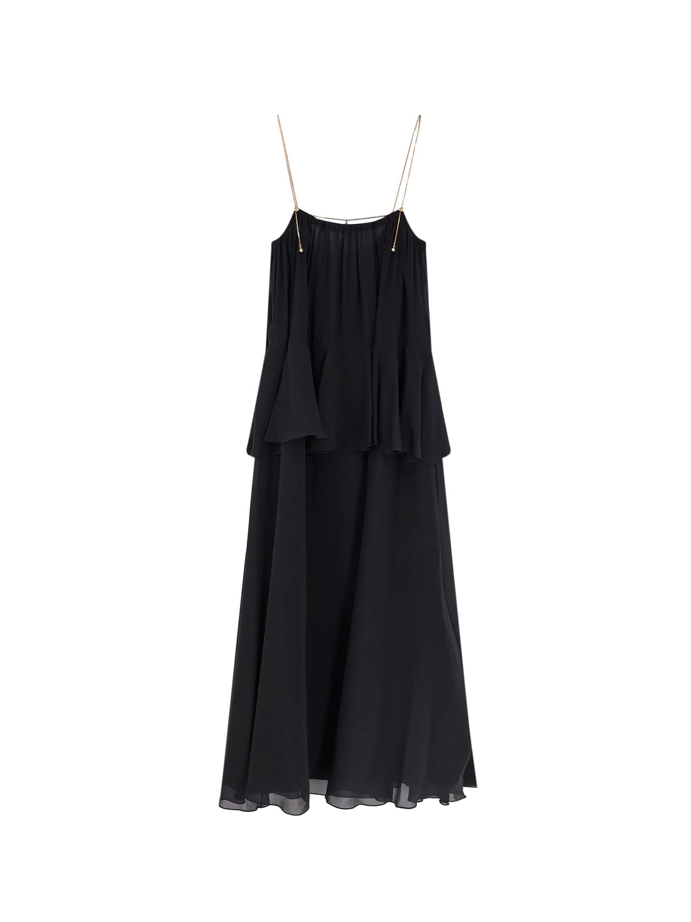 Sleeveless Gold metal details Metal logo charm Ruffle profile 100% silk Lining: 90% acetate fiber, 10% silk SKU: CH26SRO03002001