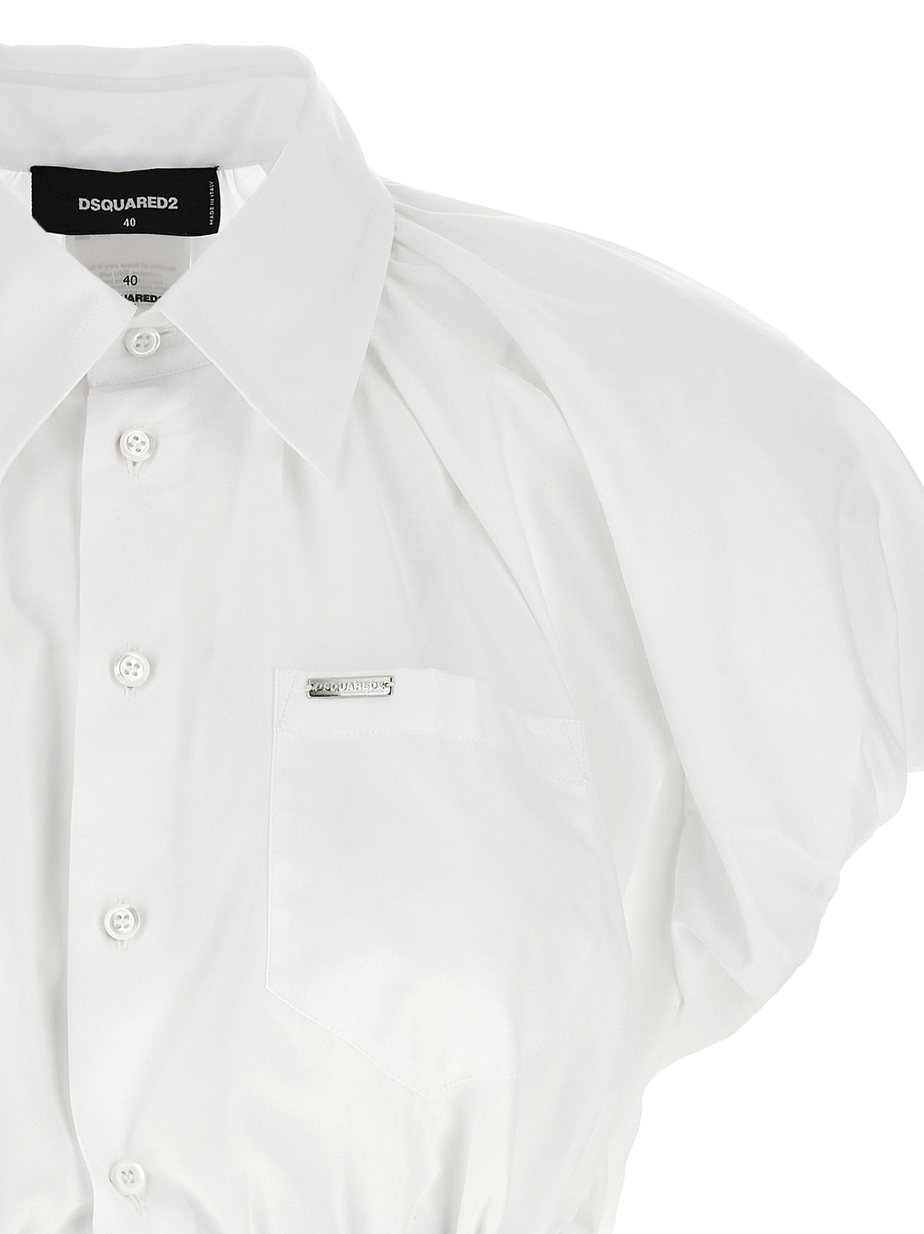 Cotton shirt, crop model, classy collar, metal logo application on the pocket, curled on the bottom and sleeves, front button closure.