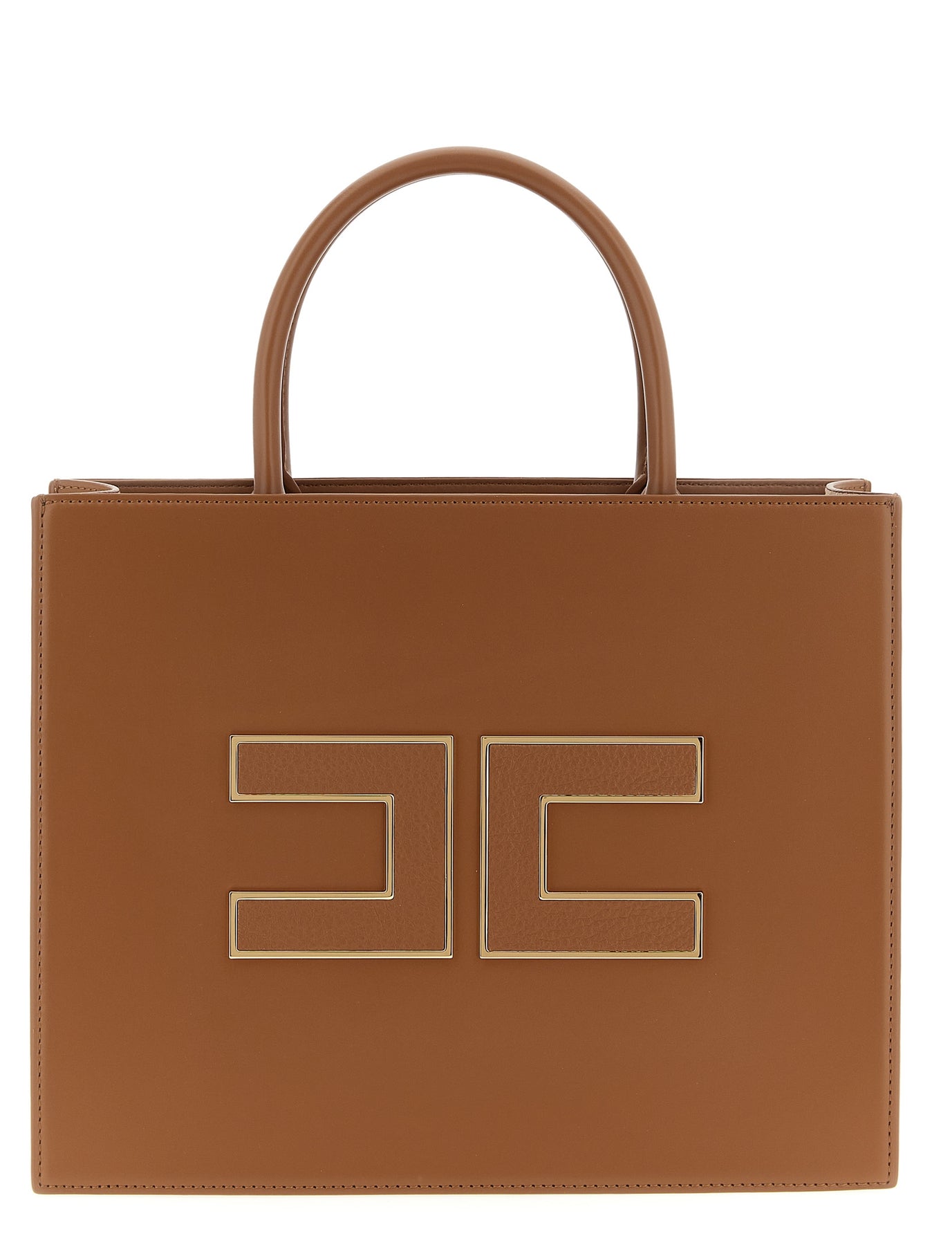 Large shopping bag in smooth leather-effect fabric, maxi metal logo with front hammered leather interior, double fixed handle, top zip closure, adjustable and removable shoulder strap.