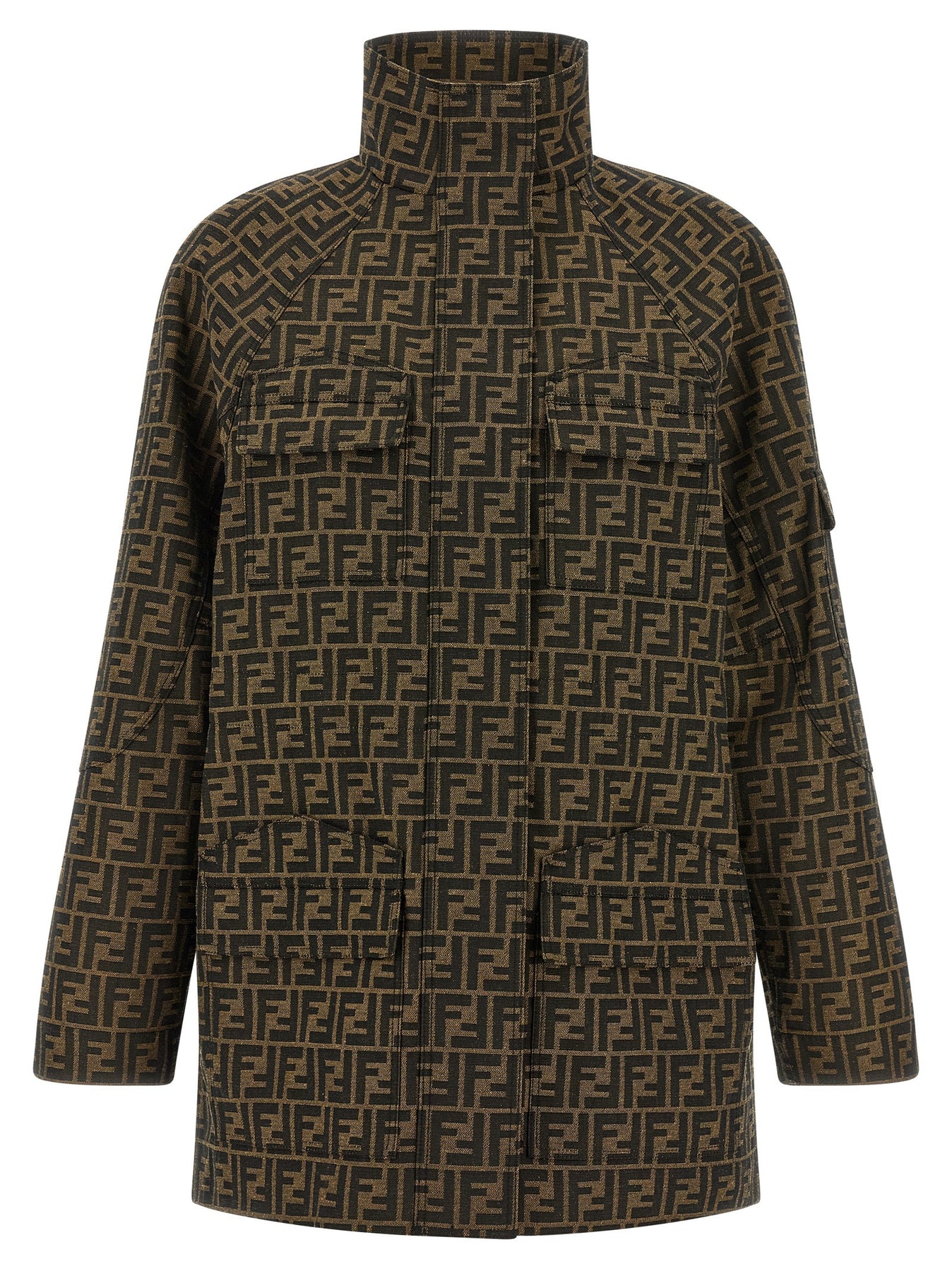 Jacquard canvas jacket with iconic FF pattern, Saharan model, standing collar, zip closure and front snap buttons, drawstring at the waist, pockets, long raglan sleeves.