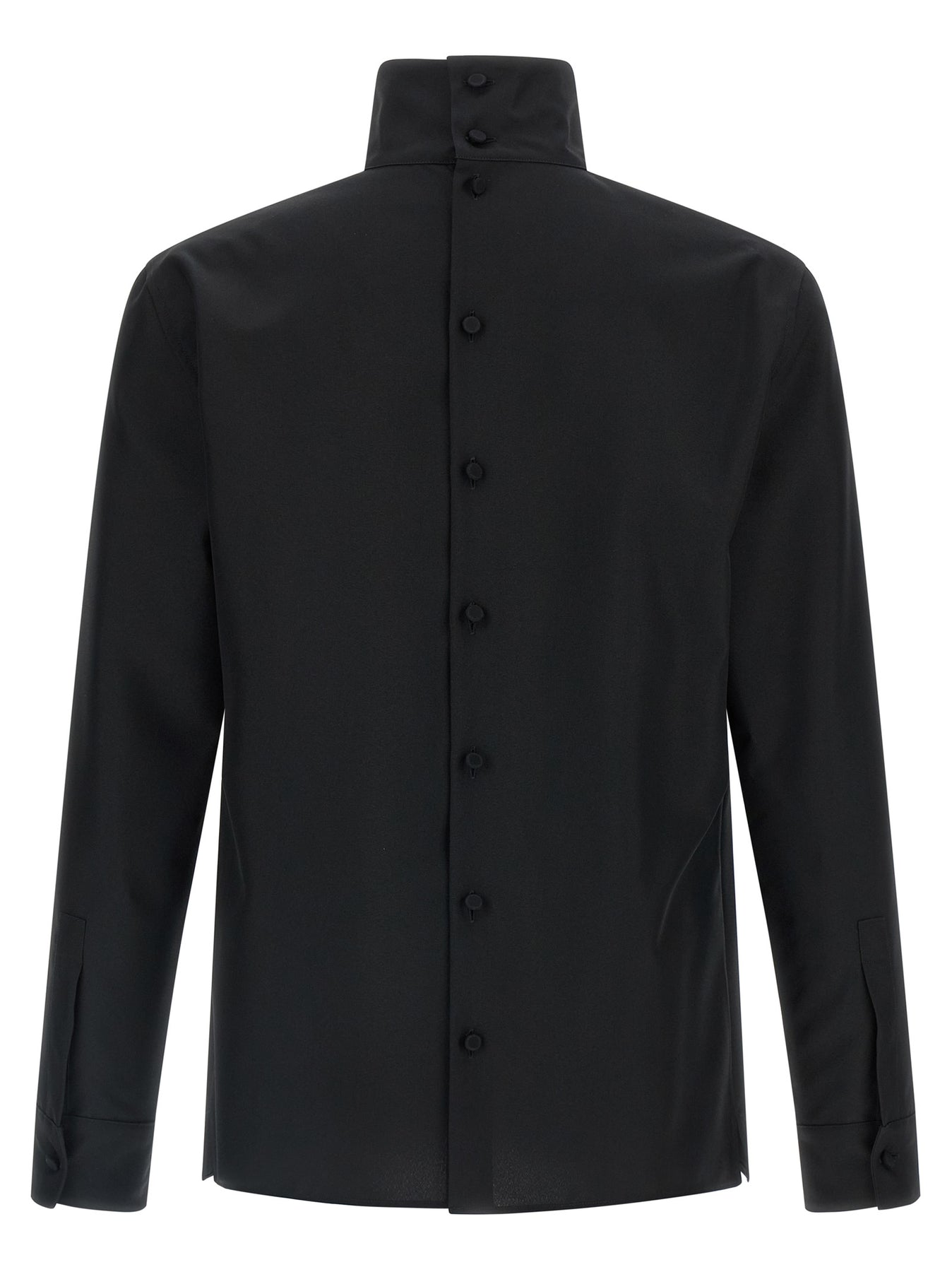 Technical Panama shirt, high collar, back button closure, long cuffed sleeves, side slits.