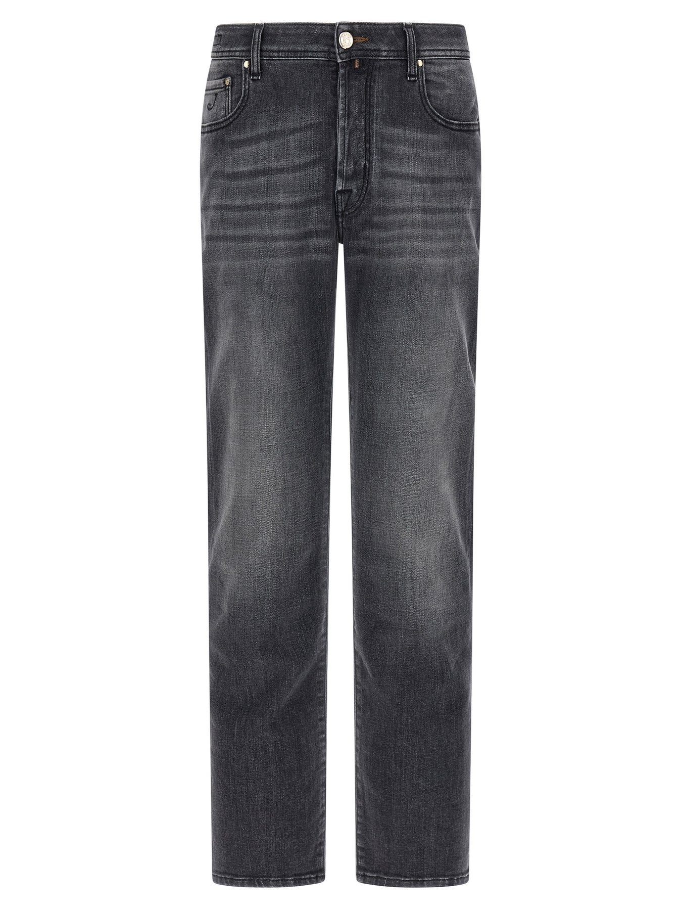 'Bard' vintage effect stretch cotton denim jeans with rinse wash, mid waist, front button closure, five pockets, back leather logo tag.