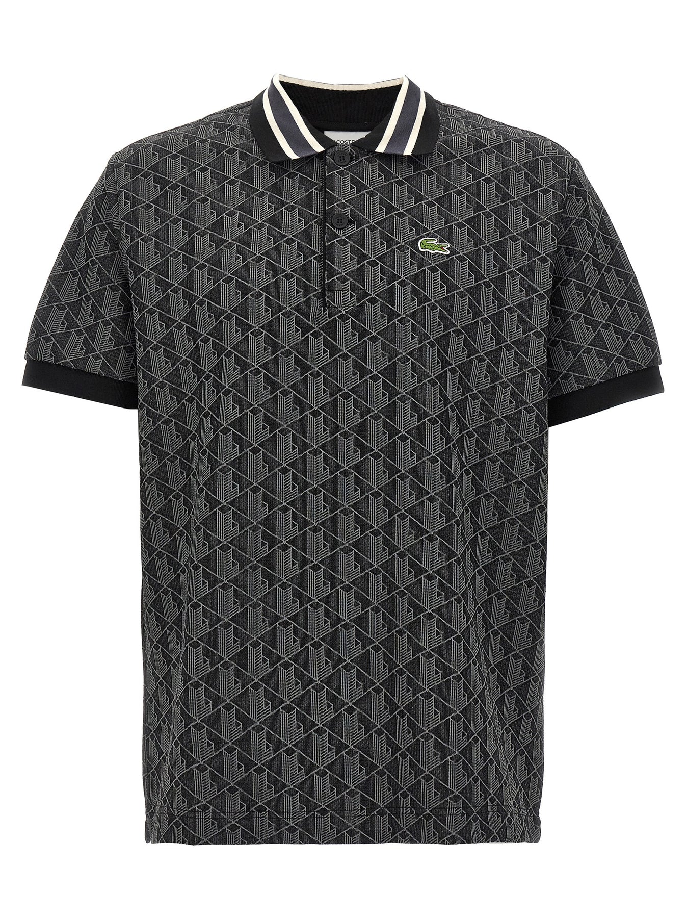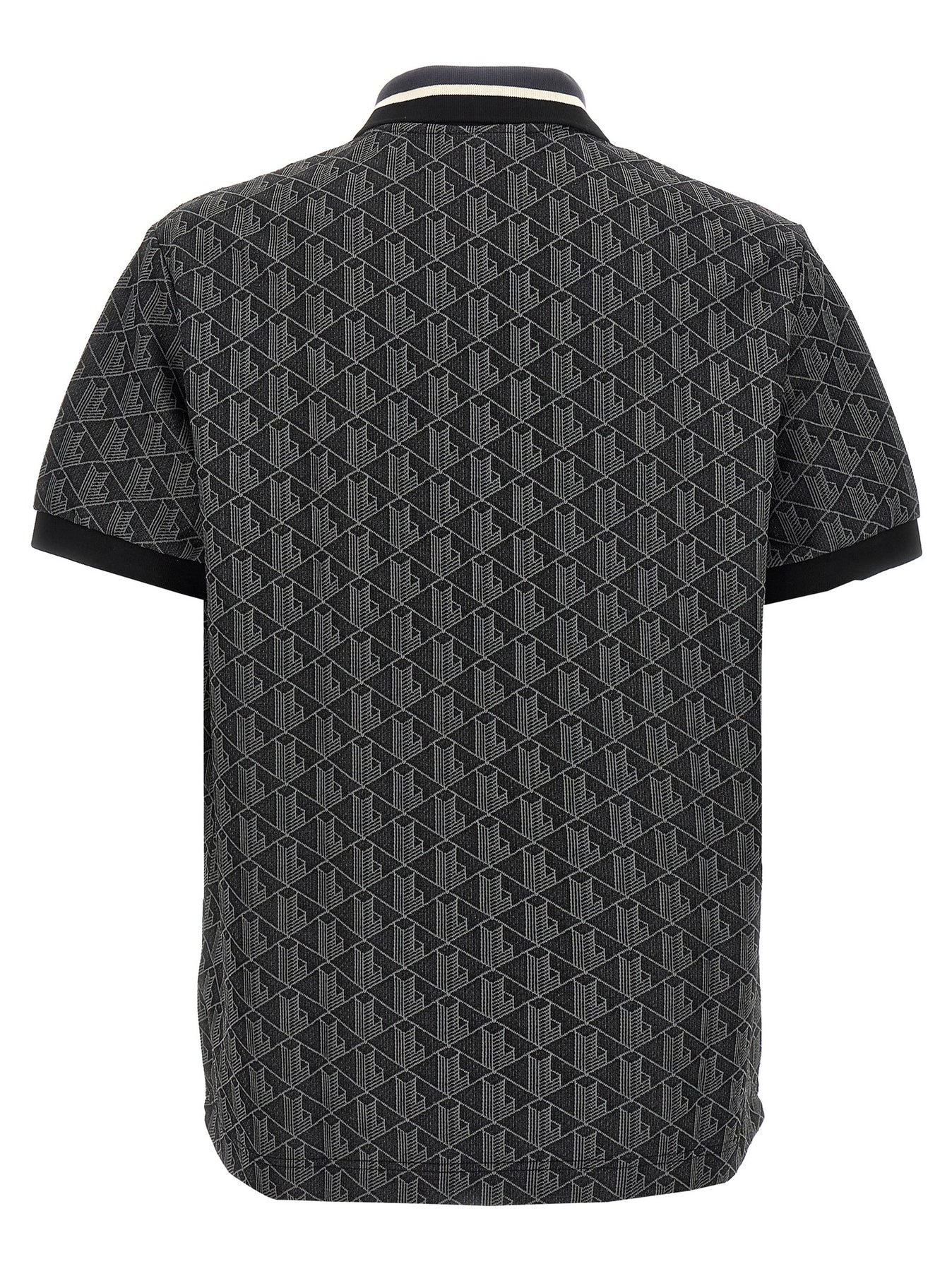 Stretch knit polo shirt with jacquard monogram pattern, collar and buttons, front logo patch, short sleeves with cuffs. SUSTAINABLE: Product made from recycled polyester and organic cotton.