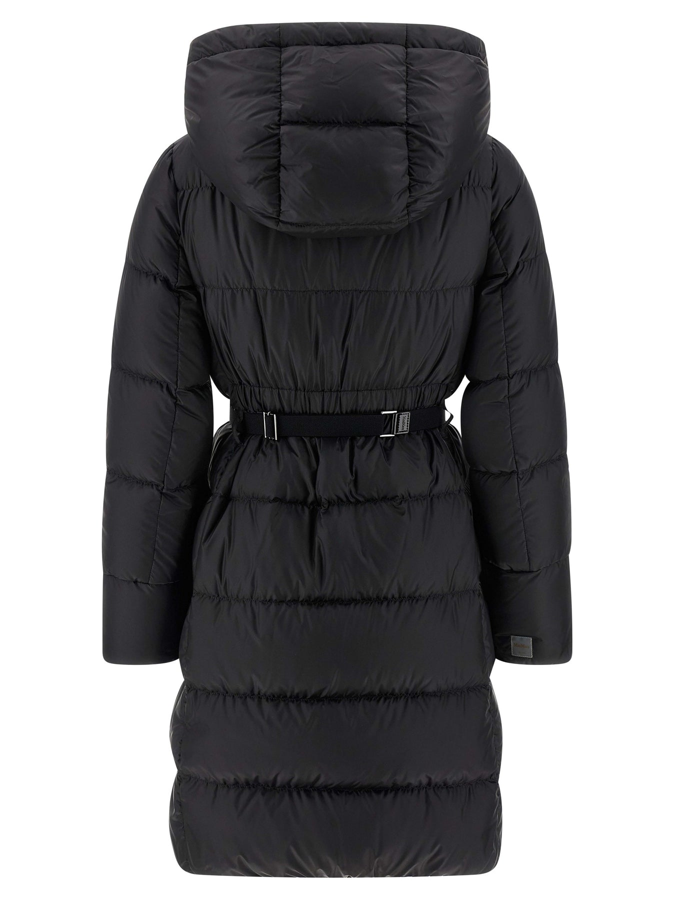 'Seipar' down jacket in waterproof technical canvas quilted with horizontal stripes and goose down padding, hood, front zip closure, pockets, long sleeves, elastic tape belt and removable snap hook buckle.