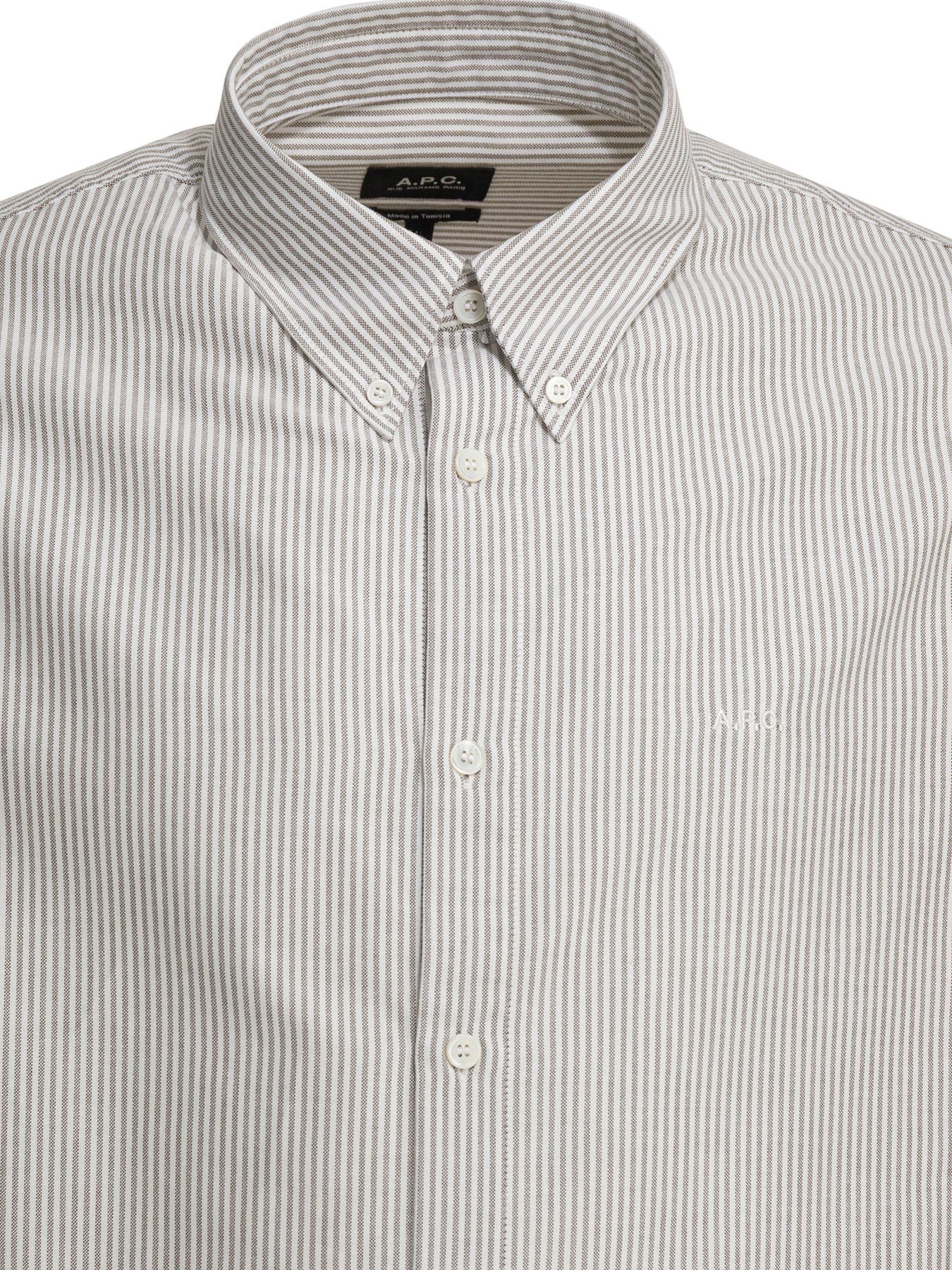 A.P.C. "Greg" shirt, made of 100 percent organic cotton, features a straight-cut construction with a basic silhouette and relaxed structure. Slightly sloping shoulders promote a soft fall of the fabric. The button-down collar with button closure replaces the typical stiffness with an understated line. At the heart, the A.P.C. logo is tone-on-tone embroidered, ensuring a uniform, minimalist finish. || - Button-down collar - Long sleeves - Straight cut - Slightly sloping shoulders - A.P.C. tone-on-tone logo embroidered on the heart - Eco-friendly product - Oversize fit