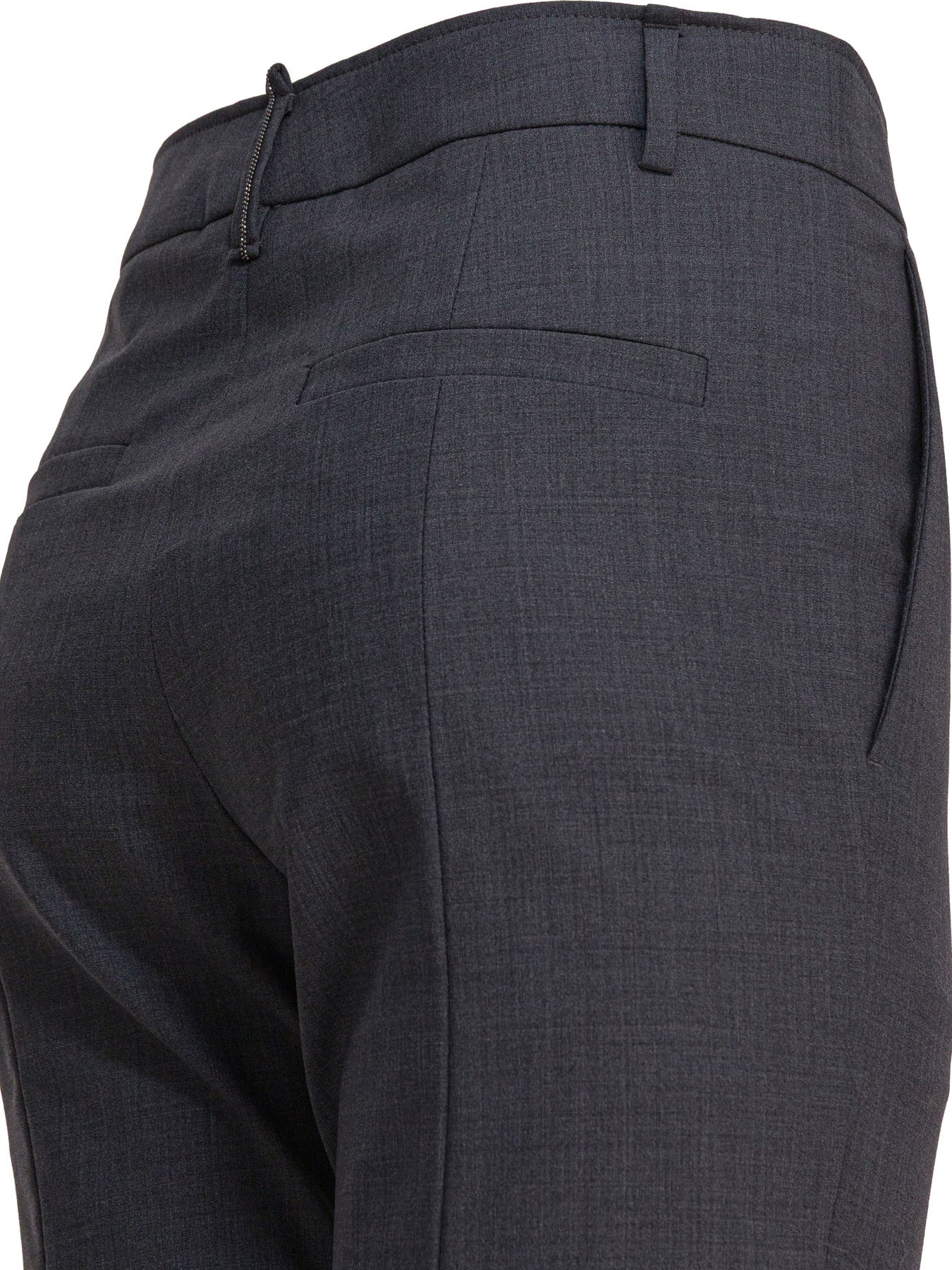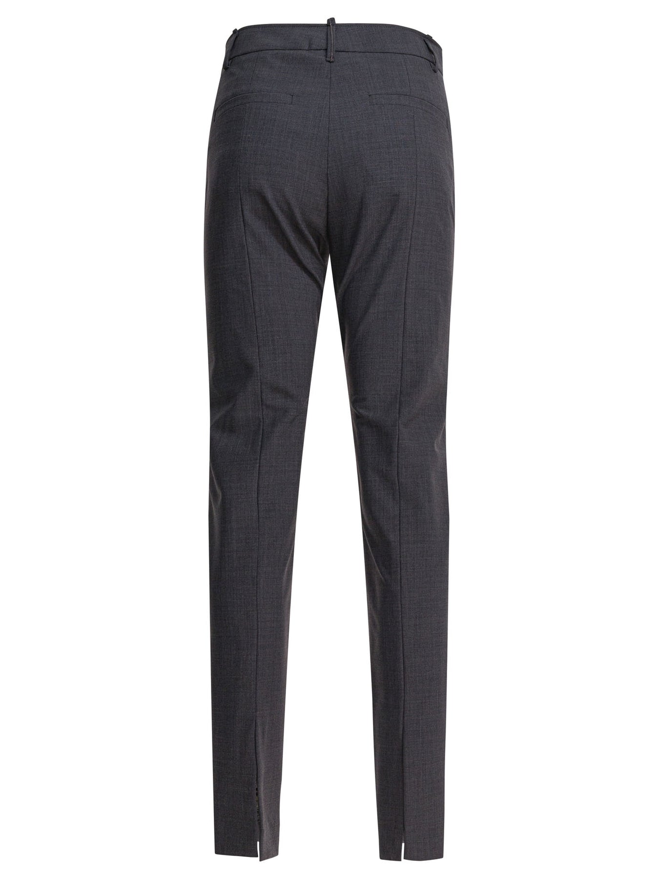 Tropical Luxury Brunello Cucinelli wool pants with cigarette construction and slightly fitted silhouette. The fabric is composed of virgin wool blended with synthetic fibers, offering lightness and comfort. The belt features a back loop decorated with a nickel-free monile insert. Structure with front darts, zipper closure with metal hook and counter-button. American-style front pockets and back welt pockets complete the garment. || - Solid color - High waist - 75% virgin wool, 23% polyamide, 2% elastane - Zipper closure with metal hook and counter button - American-style front pockets - Back welt pockets - Front darts - Nickel-free monile insert on back loop - Slim fit