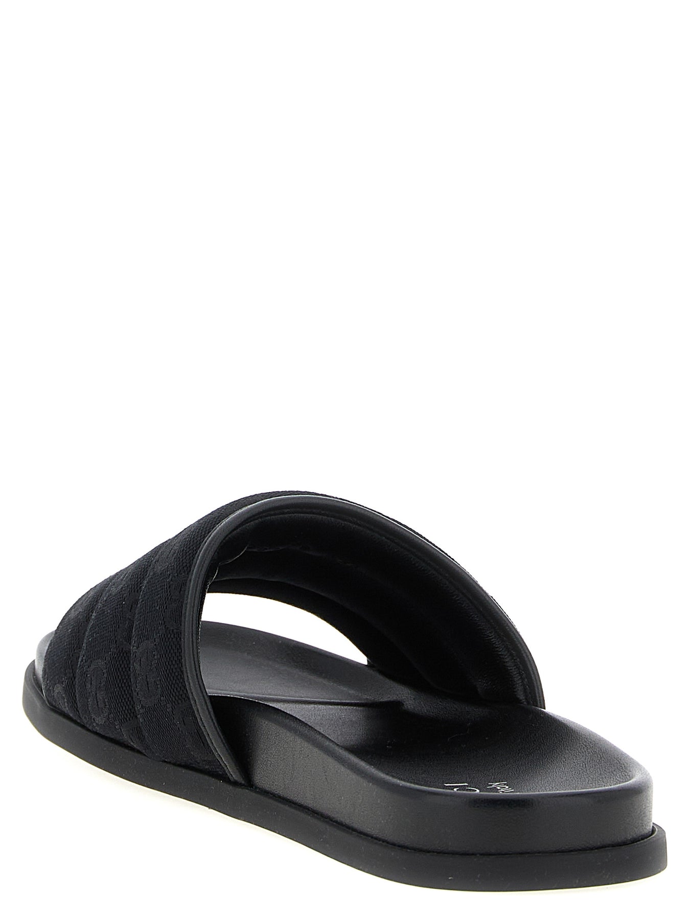 Slides in padded GG fabric, leather lining, GG rubber sole.