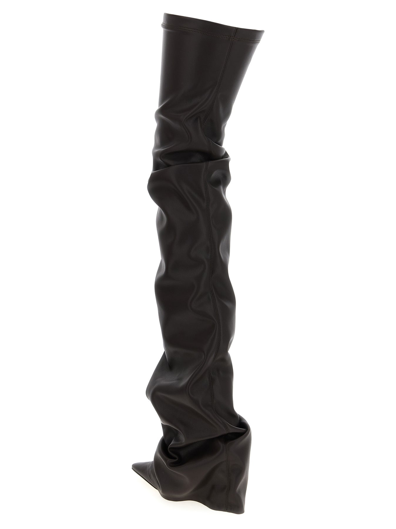 'Robin OTK' boots in leather-effect fabric with side metal detail, square toe high at the thigh, heel, leather sole.