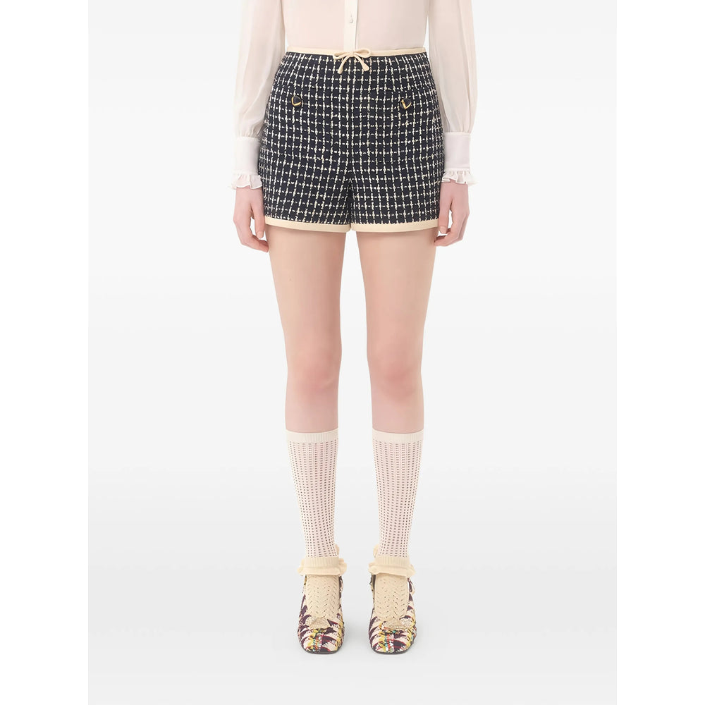 navy blue concealed side zip fastening V-gold detail check pattern contrasting trim The model is 176 cm / 5'9'' tall and wears an Italian size 40