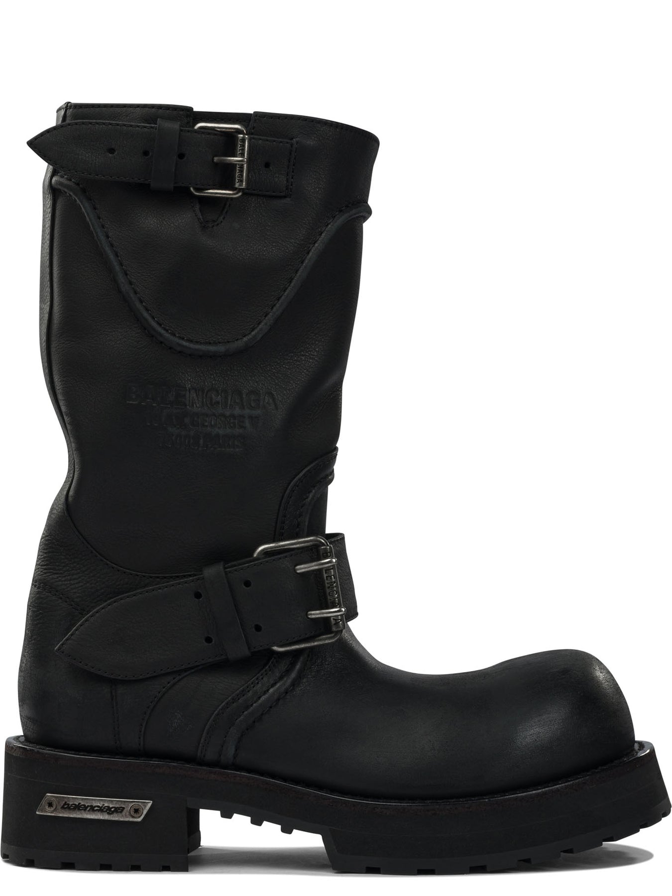 Balenciaga "Venom" boots made of leather with a worn-effect finish. The structure features a compact silhouette, characterized by straps with adjustable buckles arranged crosswise on the upper. Photo-engraving of the Balenciaga logo and address 10 AV George V 75008 Paris is visible on the upper surface, while an engraved logo plaque is applied to the side of the sole. The base incorporates a pronounced curvature of 20 mm. || - Leather upper with worn effect - Curvature on sole 20 mm - Cross straps with adjustable buckles - Balenciaga logo and address embossed on upper - Engraved logo plaque on the outer side of the sole