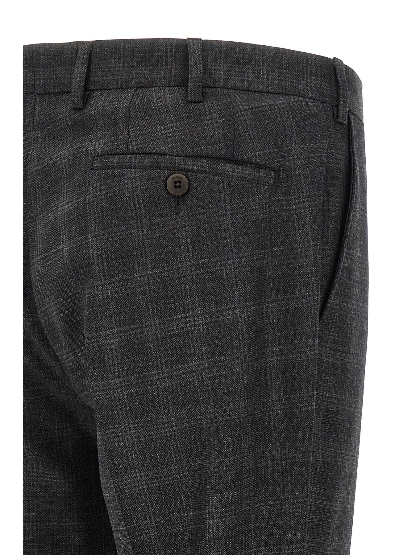 Prince of Wales patterned wool 'Lord' dress consisting of single-breasted blazer with front button closure, mirror lapels with removable metal brooch, breast pocket, flap pockets, cupro lining, two inner pockets, buttonhole cuffs, back slits and ironed pleat trousers, front 'americane pockets', back welt pockets, front zip and button closure, viscose lining.