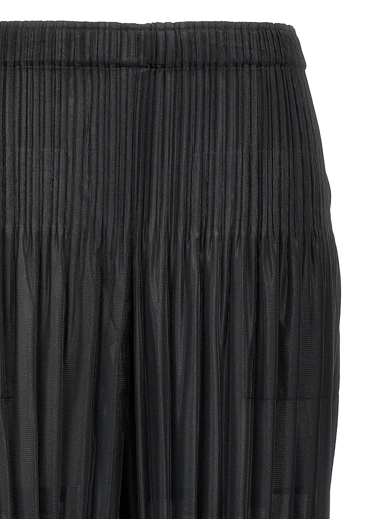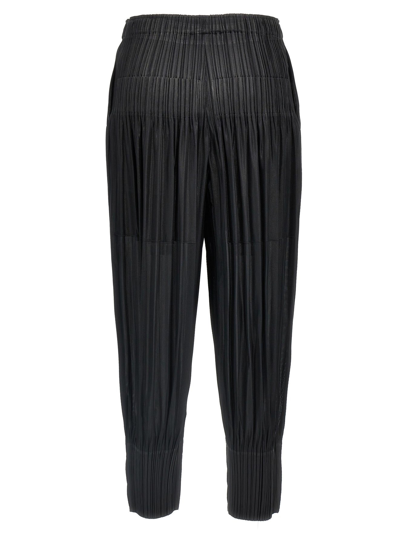 'Fluffy Basics' pleated fabric pants, elastic waistband, side and back pockets, slightly cropped fit, wider leg narrower at the hem.