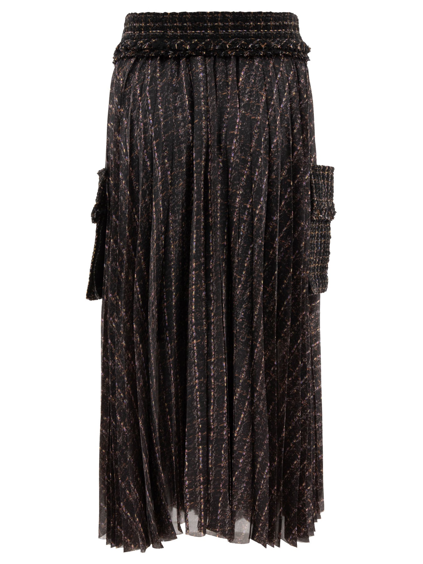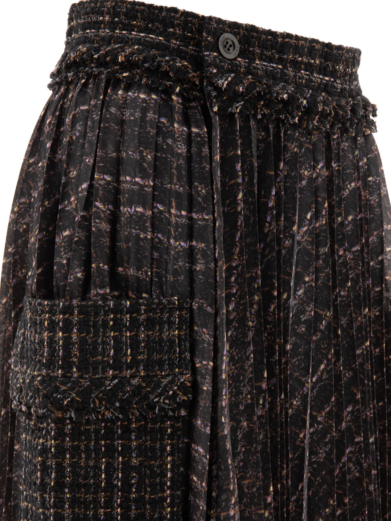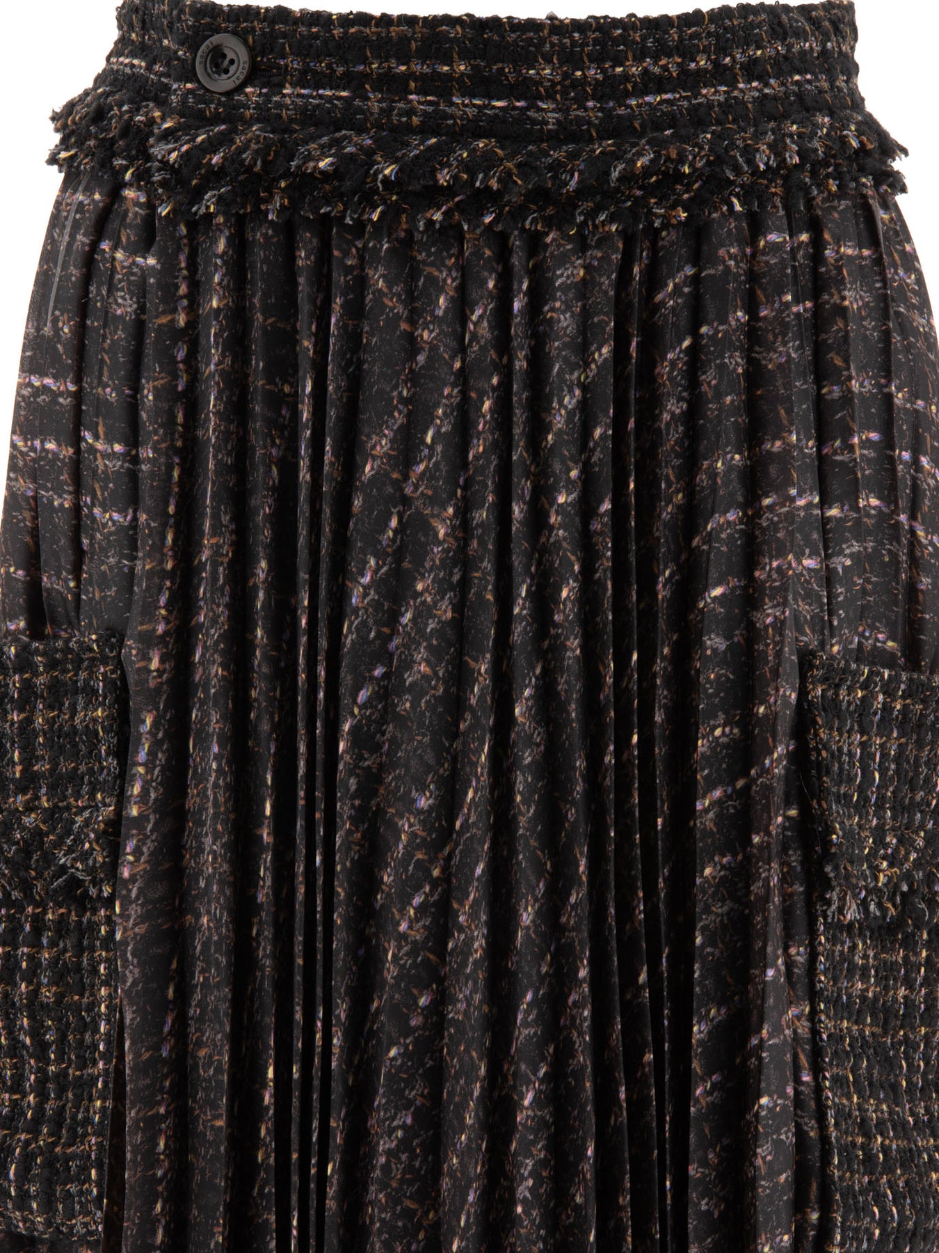 Sacai's pleated skirt with cargo pockets is an explosion of style and functionality, perfect for the woman who doesn't give up elegance while remaining practical. Its sophisticated structure fits perfectly in a variety of settings, from casual to formal, thanks to its unique and innovative design. || - Regular fit - Pleated - Button closure - Tweed inserts - Trompe-l'oeil print - Cargo style pockets - Lined || This skirt pairs beautifully with a white shirt and tweed jacket for an elegant yet contemporary look. Complete your outfit with a pair of leather ankle boots and a medium-sized handbag for a sophisticated finishing touch.