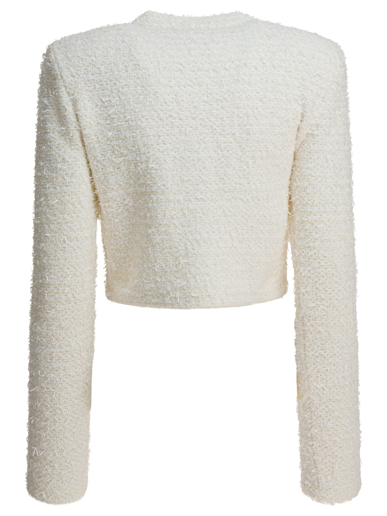 Self-portrait wool-blend embellished cardigan with a stretch-woven bouclé knit structure, long-sleeved construction and a linear silhouette. The closure is front with snap buttons, and key details include piping embellished with decorative appliqués. Functional elements include faux diamond buttons, while the regular cut contributes to a precise fit. The composition involves mixed natural and synthetic fibers. || - Embellished with rhinestone trim - Long sleeves - Bouclé knit - Faux diamond buttons - Stretchy fabric - Regular fit