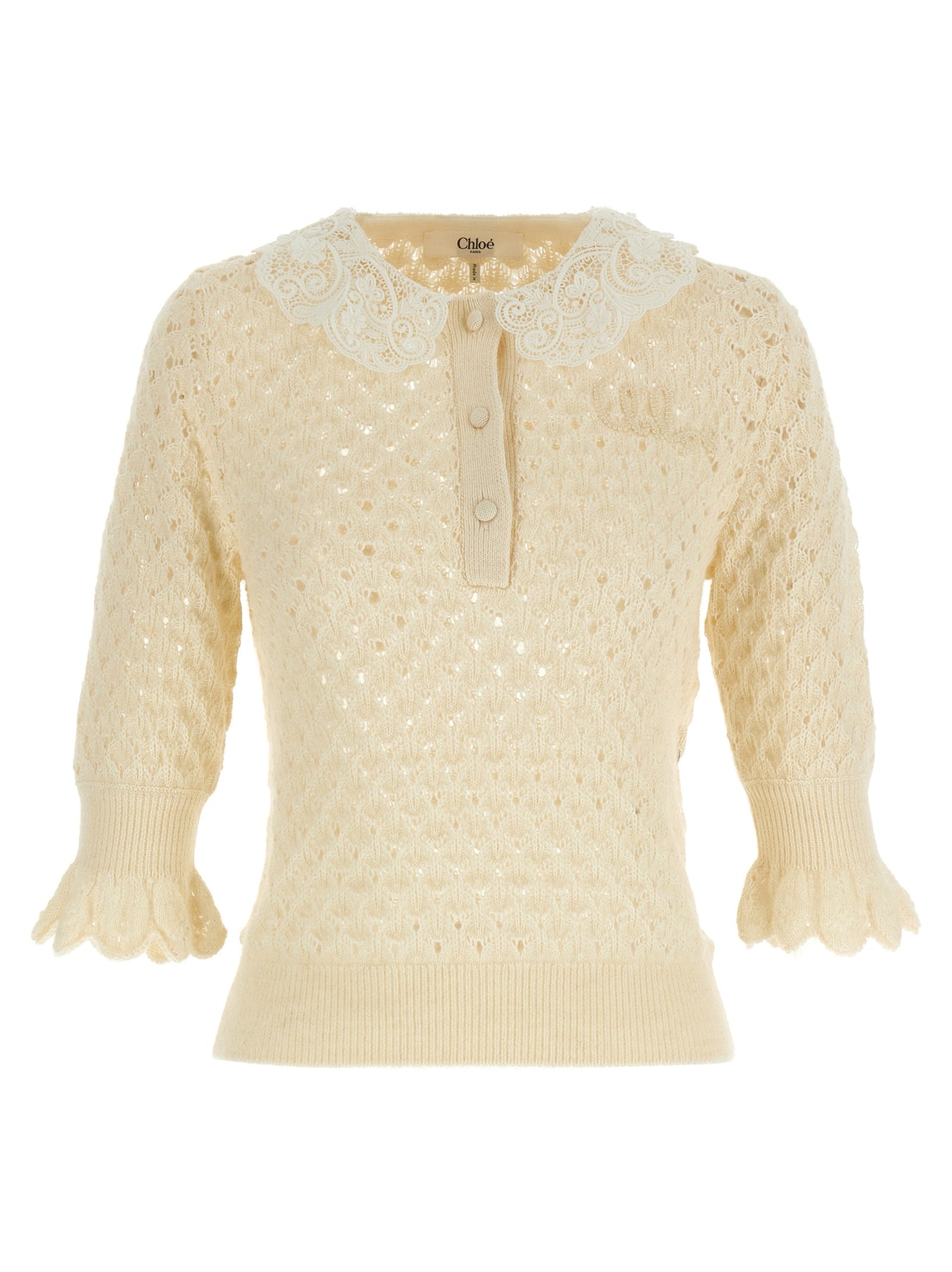 Wool and silk blend sweater with pointelle pattern, tone-on-tone lace collar, tone-on-tone embroidered logo and front button closure, and short puff sleeves with cuffs.