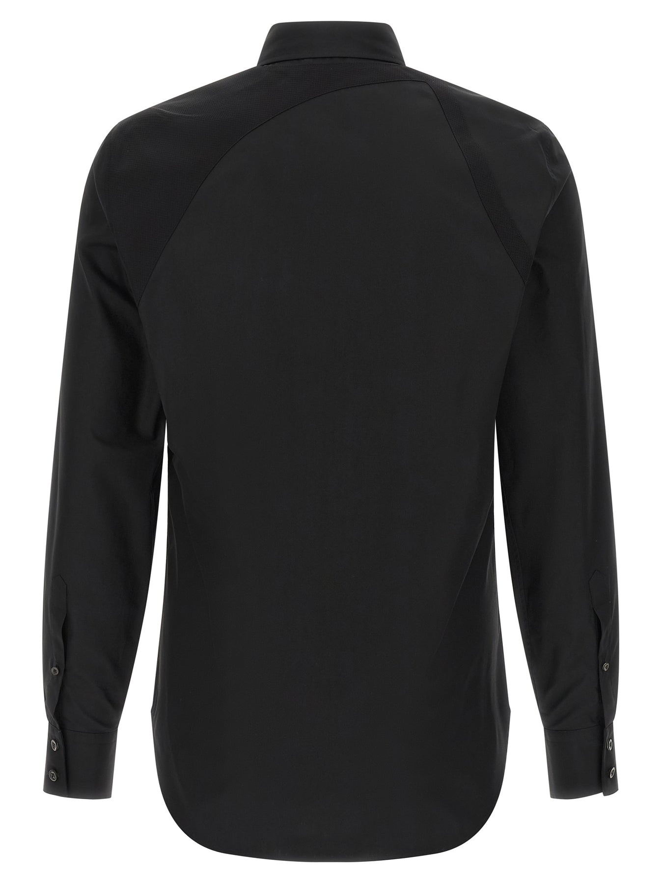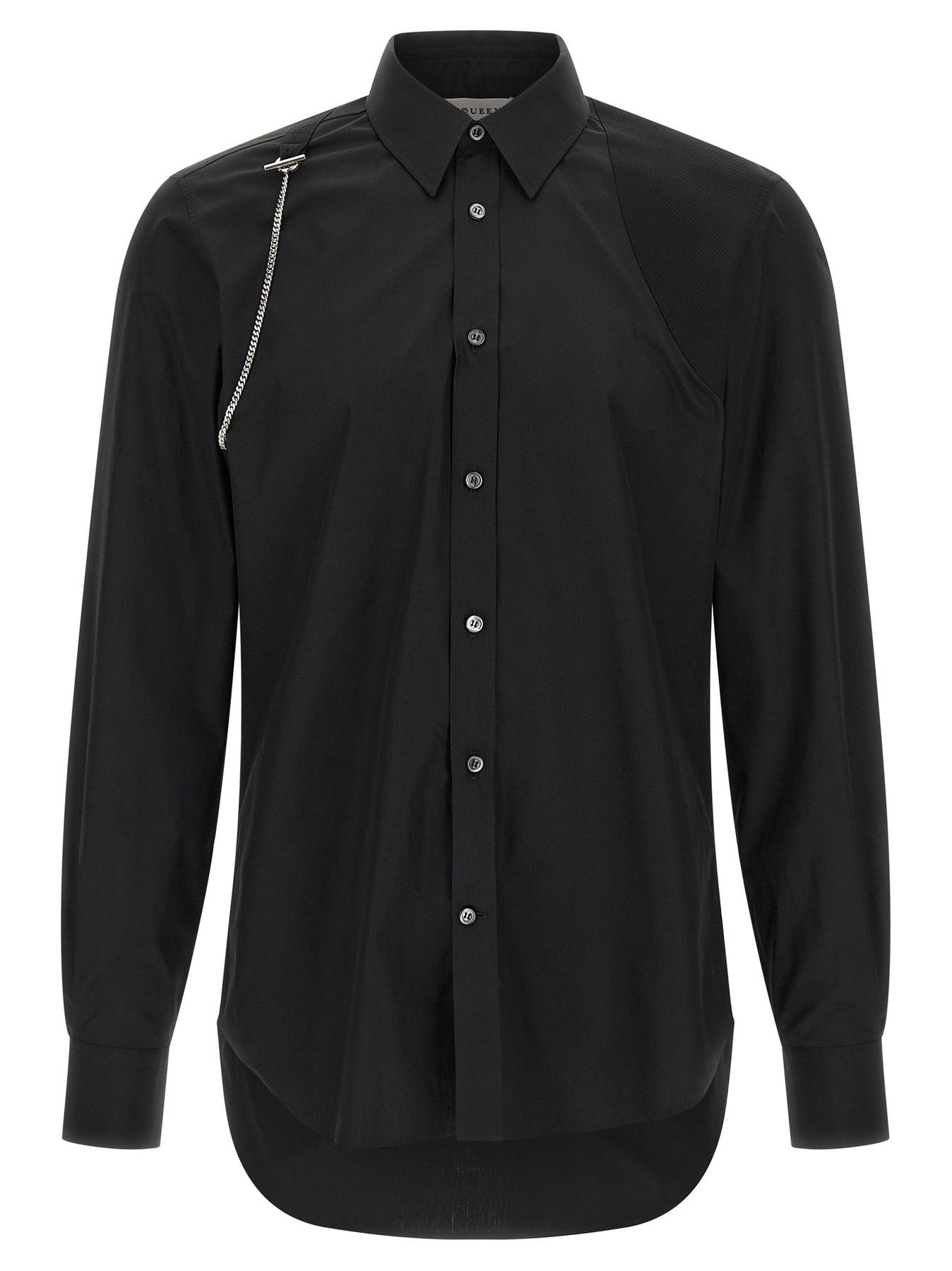 Cotton poplin shirt with 'T Chain Harness' insert consisting of tone-on-tone honeycomb fabric and removable metal T-chain, front button closure, long cuffed sleeves.