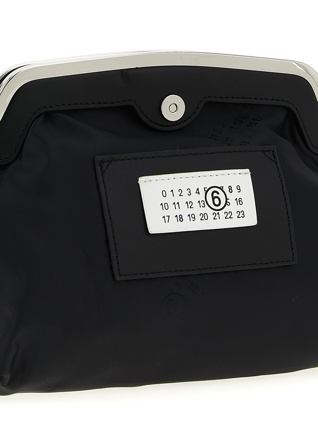 All-over monogram nylon clutch bag with leather details, 'Numeric signature MM6 Inside-Out' design, top metal frame, contrast 'Numeric signature MM6' patch on the front, snap button closure, adjustable and removable shoulder strap.
