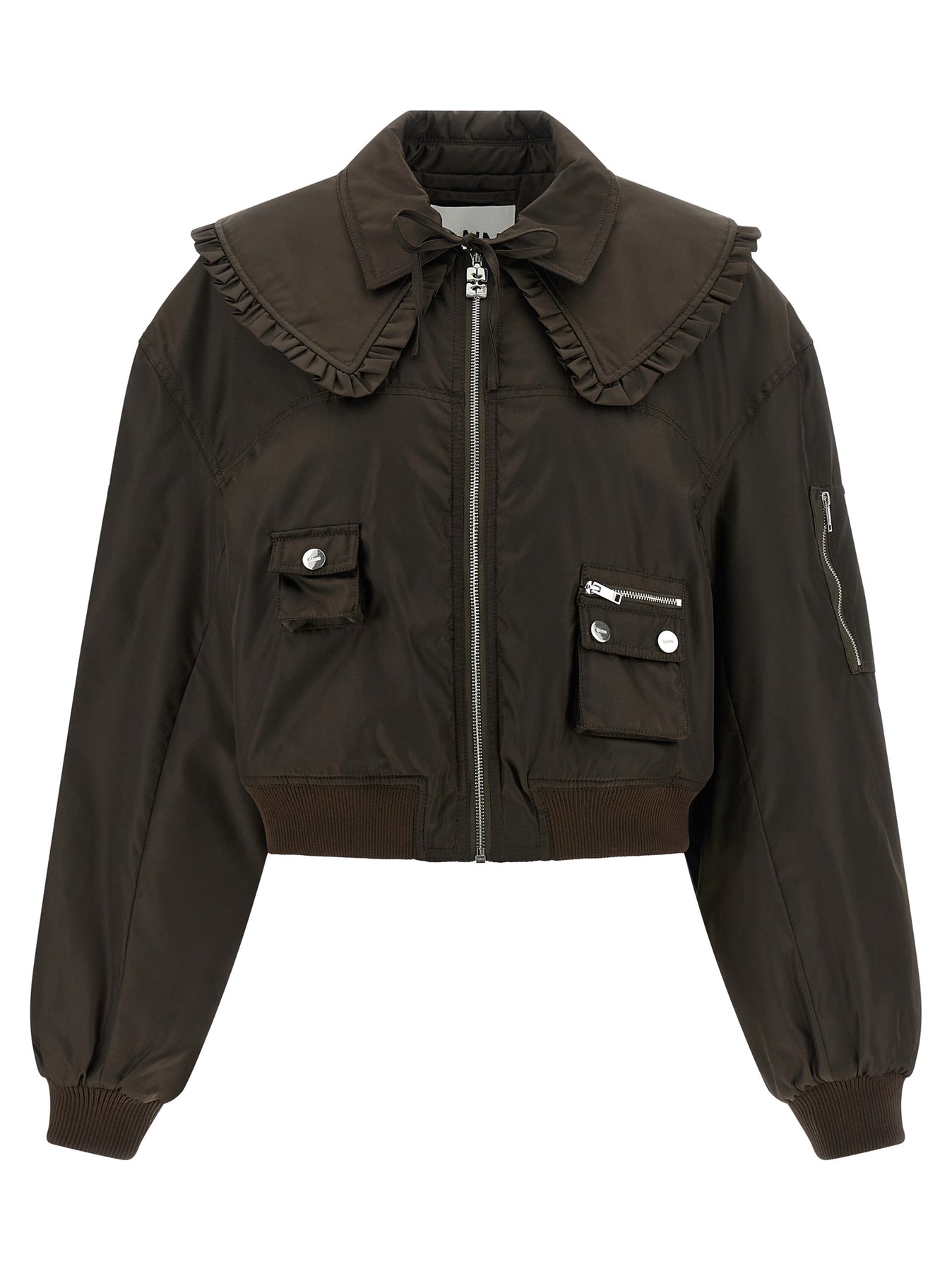 Duchesse 'Duchesse Nylon' nylon bomber jacket with tone-on-tone stretch ribbed knit details, slightly cropped lapel with removable ruffles, shirt collar, front zip closure, pockets, long wide sleeves with cuffs and dropped shoulder, band on the hem, monogram viscose blend lining. SUSTAINABLE: Product made with recycled polyamide.