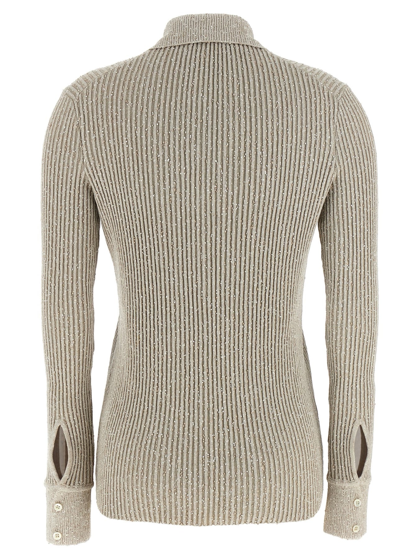 '21' ribbed viscose knit cardigan with 3D decorations, polo shirt with collar and front button closure, long cuffed sleeves.