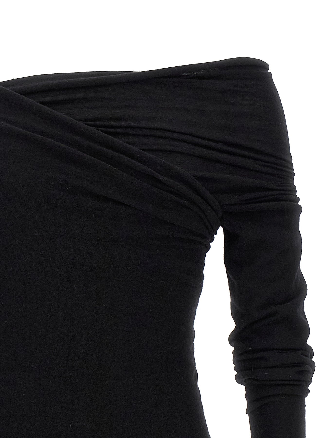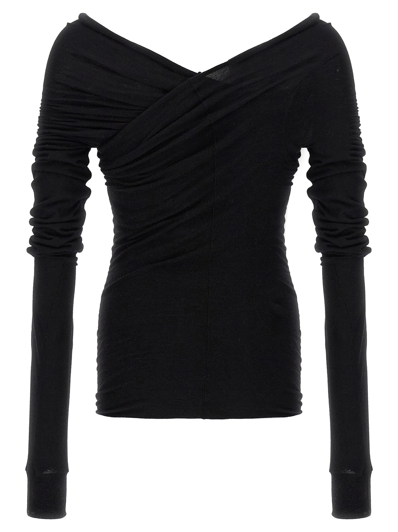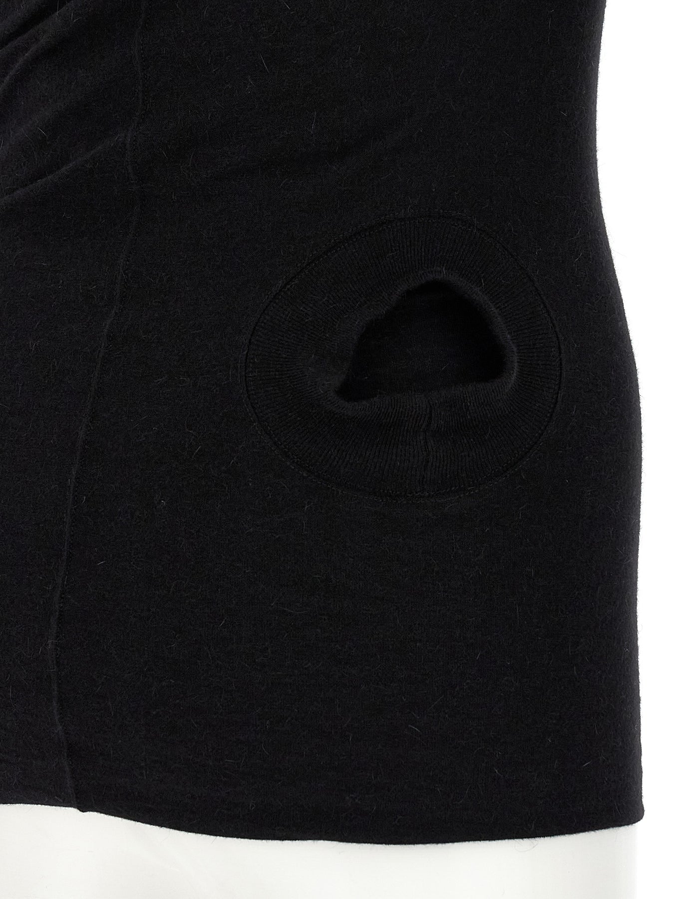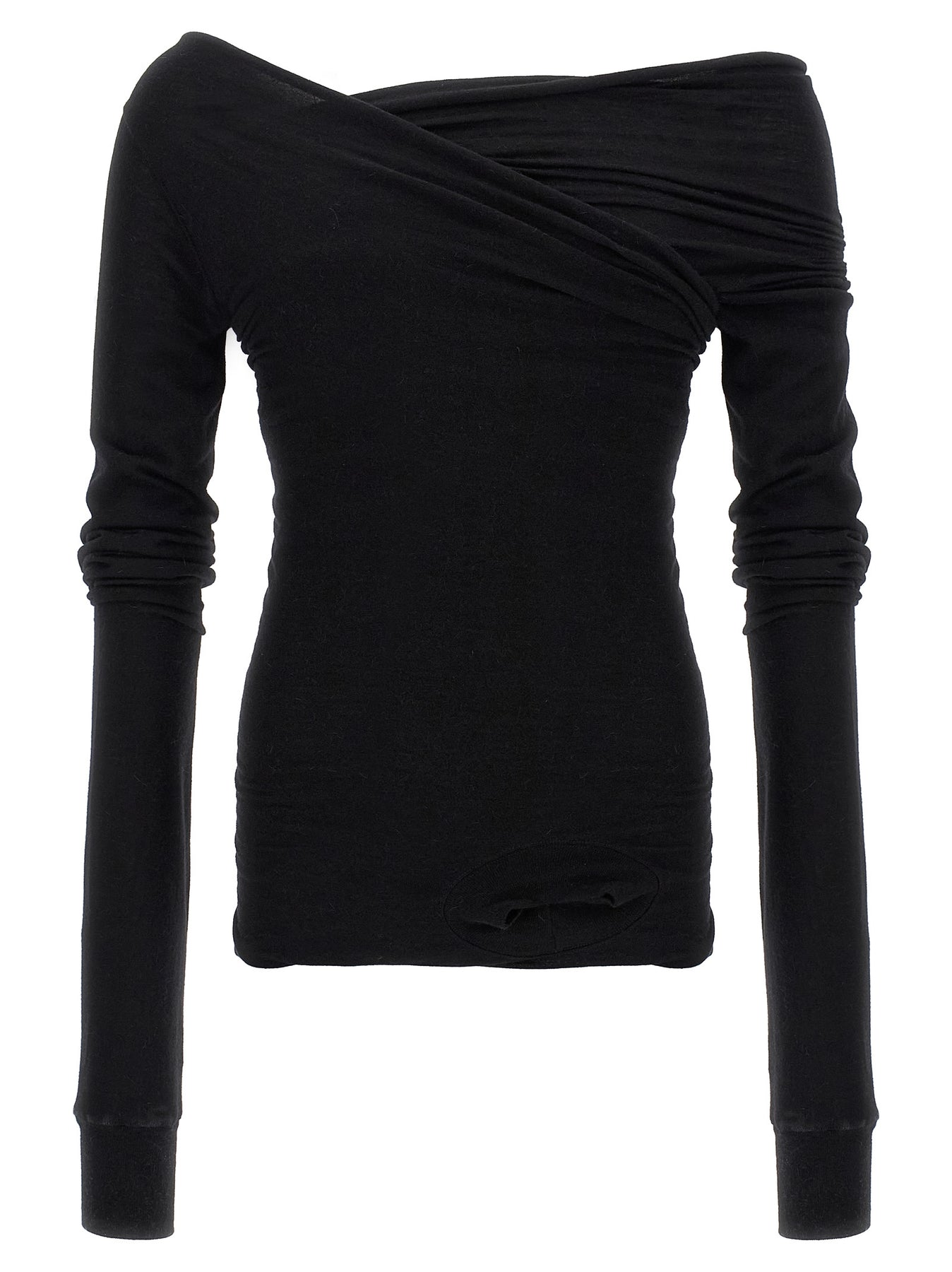 'Hollywood Banana' long-sleeved T-shirt in wool, angora and viscose blend. It has a bottom layer with two round holes with ribbed edges and an outer layer that folds to create a crossed draping on the front and back neck.