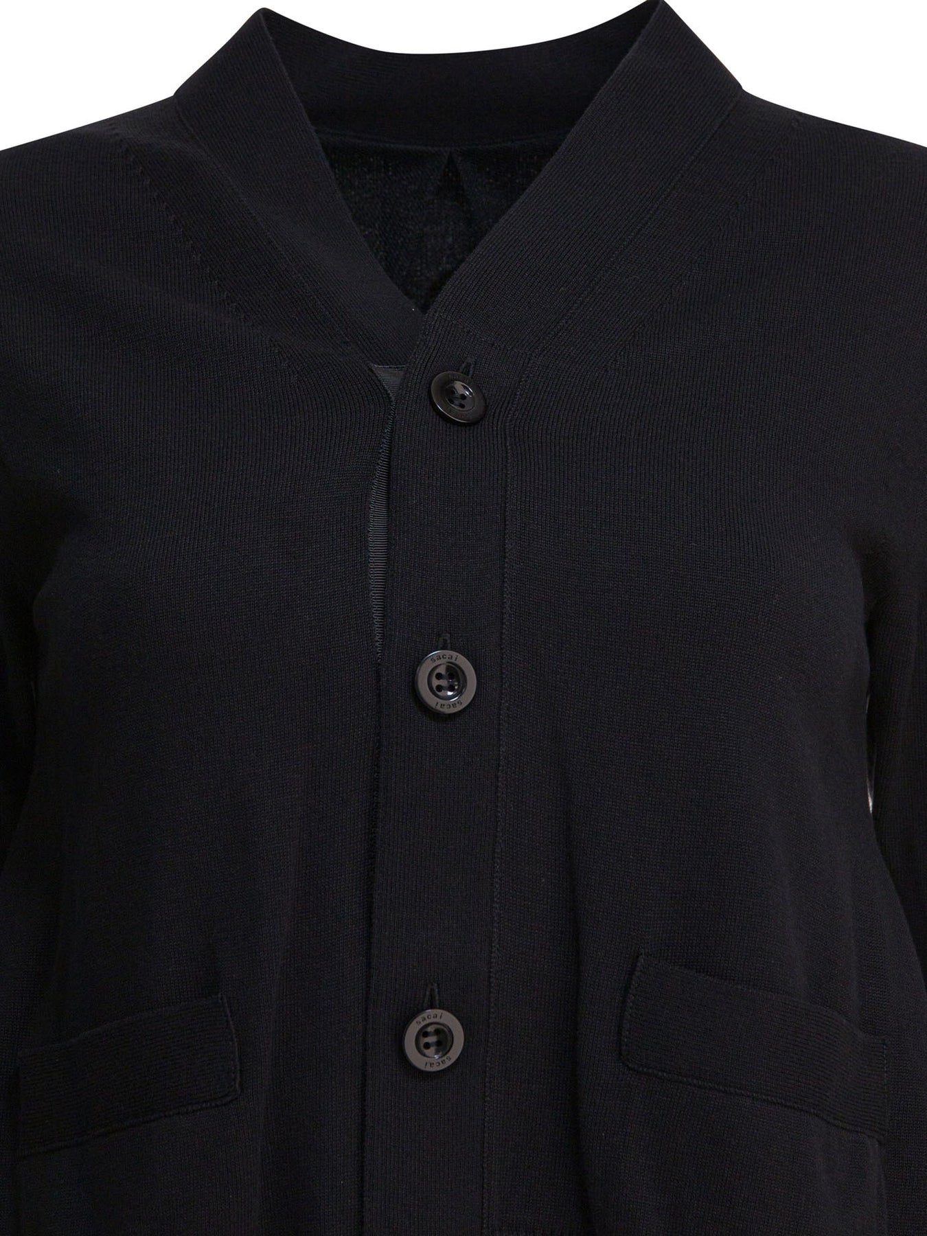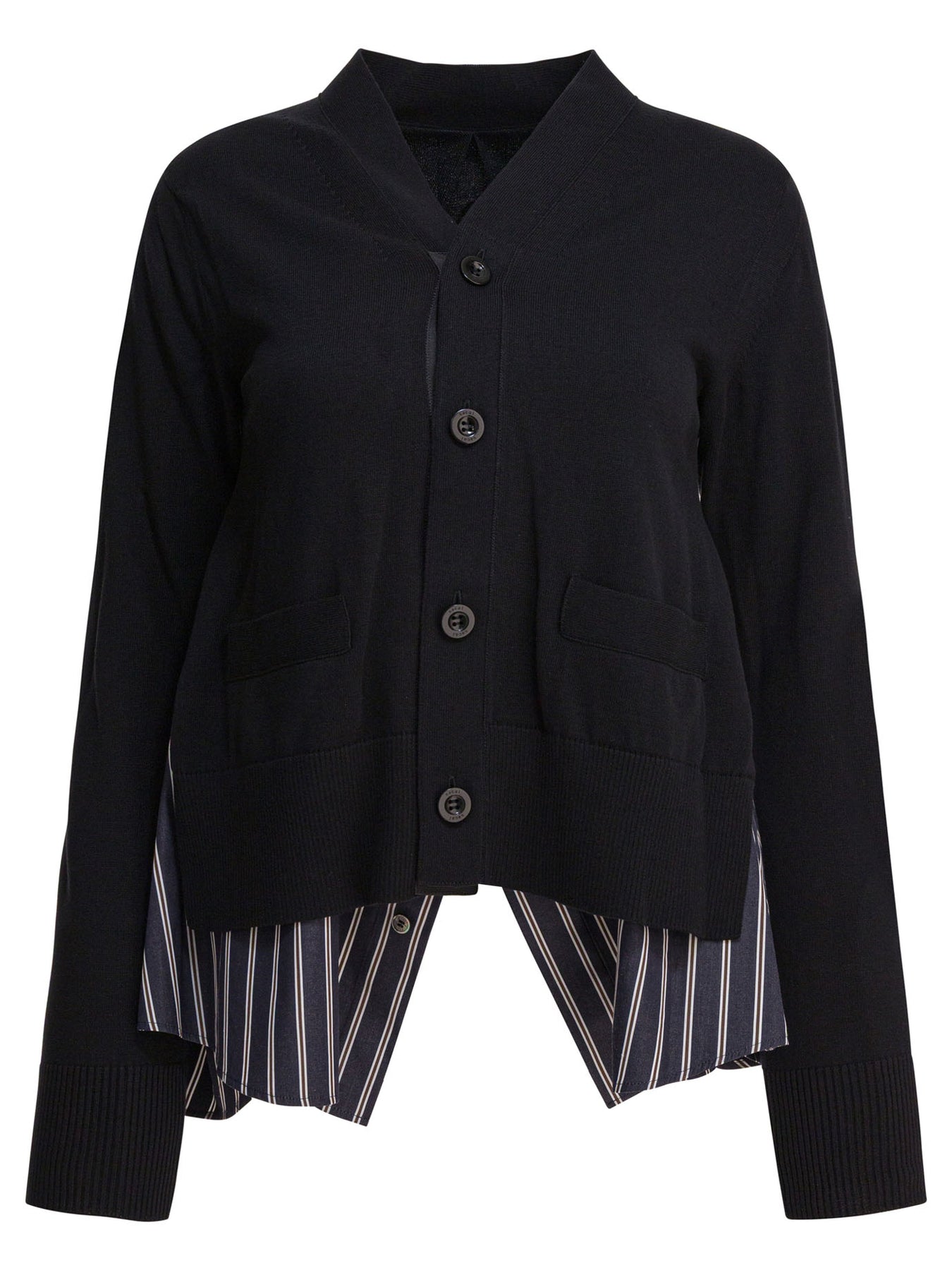 Sacai's cotton cardigan offers a fusion of comfort and style, designed for the woman who appreciates a distinctive design without sacrificing functionality. Featuring fine workmanship, this garment is an ideal choice for those who want a versatile wardrobe that can easily adapt to a variety of occasions. The combination of classic elements and modern accents makes this cardigan a unique proposition in the contemporary fashion scene. || - Solid color - Long sleeves - V-neckline - Button closure - Striped inserts - Two patch pockets - Ribbed cuffs and hem - Regular fit