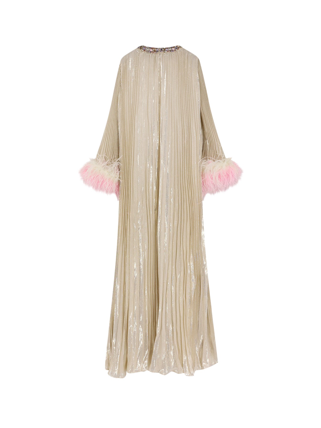 Pleated Neckline with multicolored rhinestone trim Long sleeves with ostrich feather detail Back zip closure 67% silk 33% metallic fiber Lining: 100% polyester SKU: RS26507XCHCHAMPAGNE