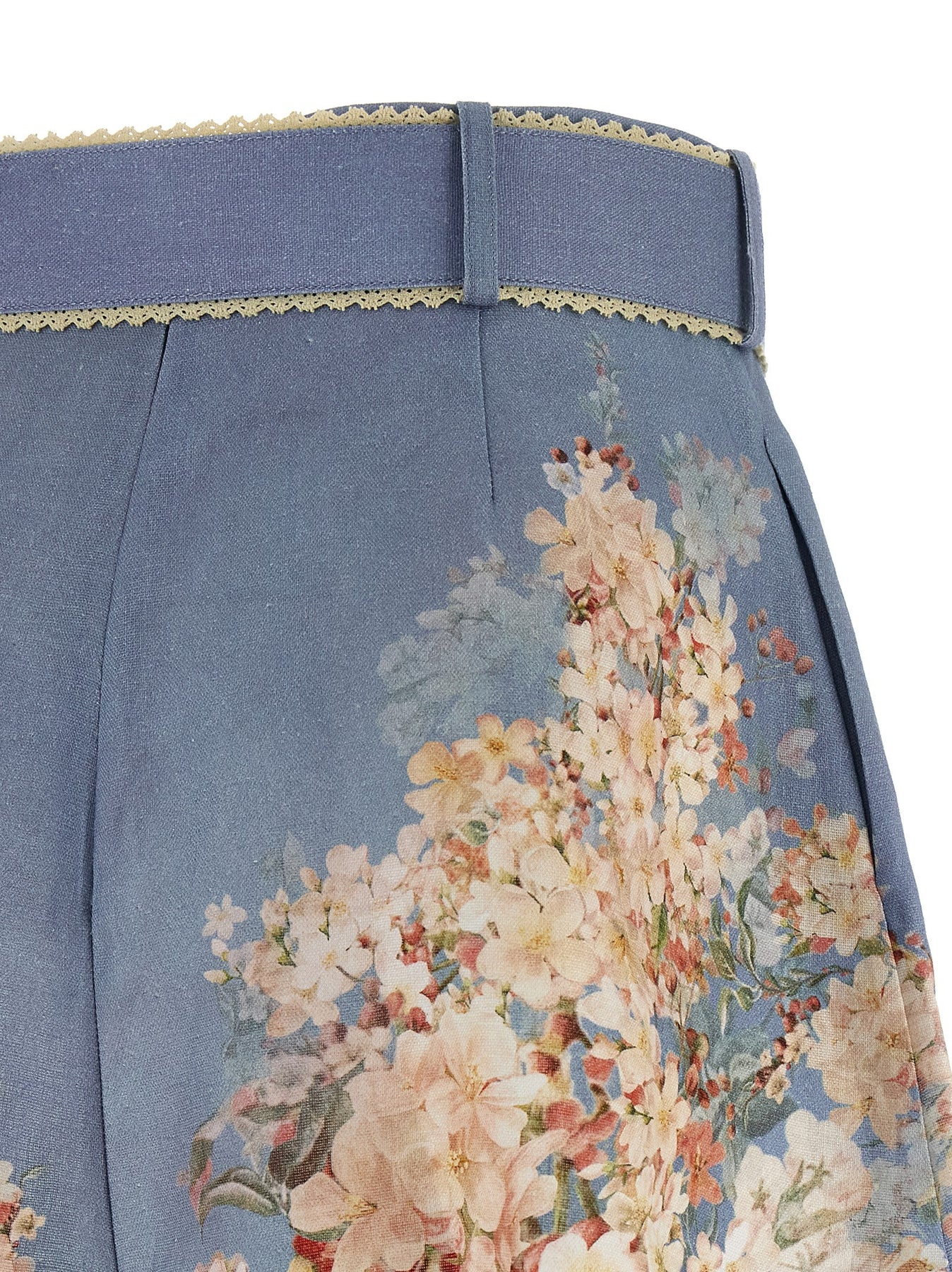 'Cascadian Tuck' shorts in linen Teal Blue Botanical Floral pattern, front pincers, back zip closure, leg bottoms with scalloped lace piping, removable belt.