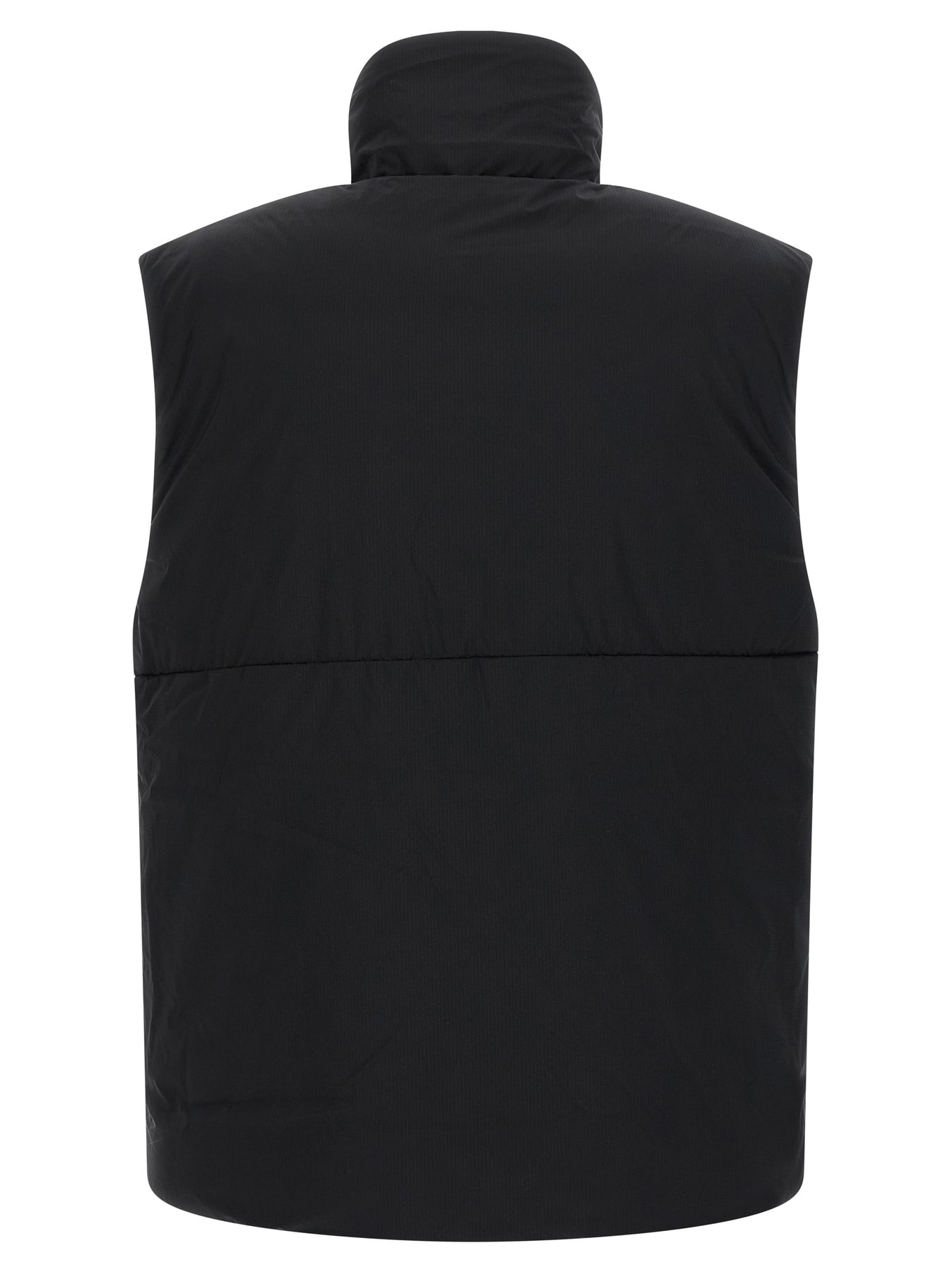 'Lodge' water-repellent ripstop vest with quilted matte finish and slightly goose feather padding, high neck, logo patch and front zip closure, pockets, drawstring on the hem. Foldable in chest pocket.