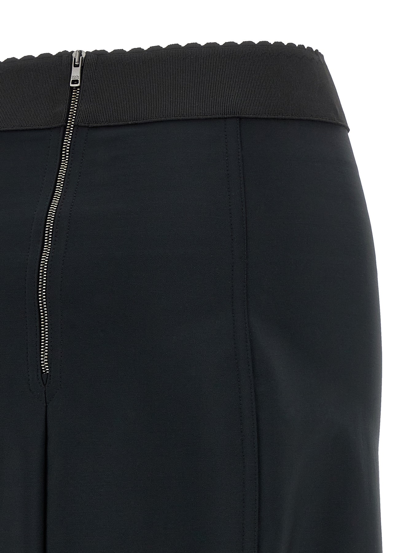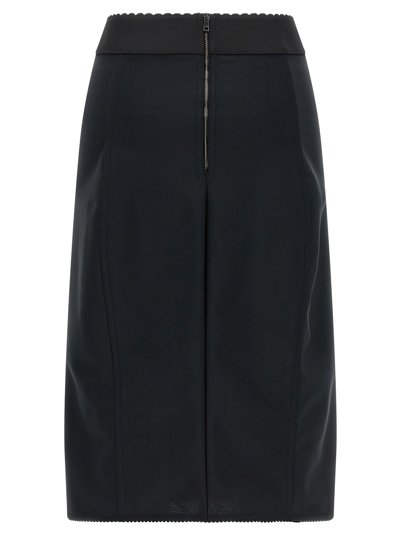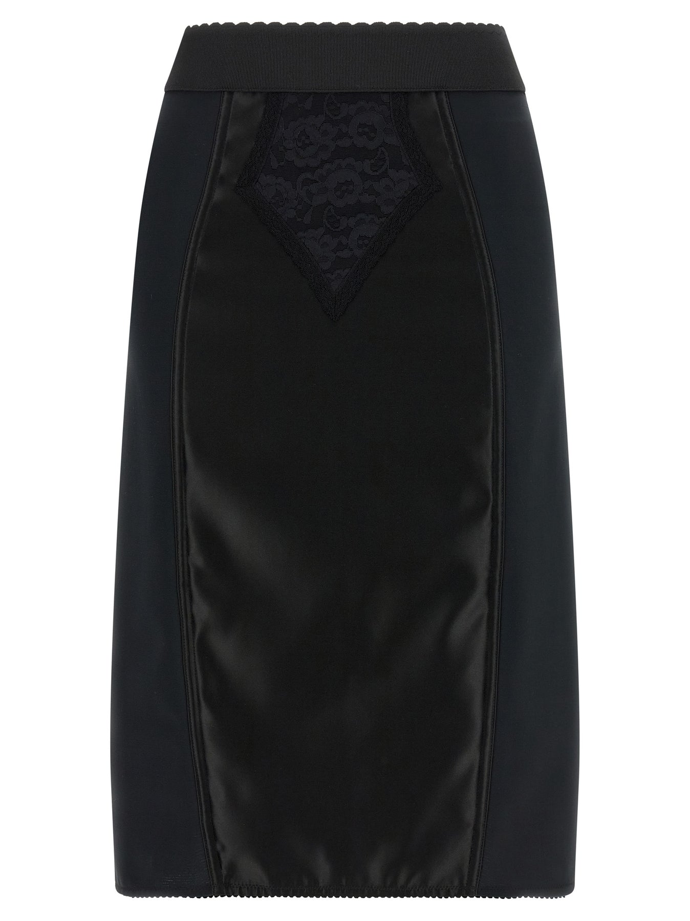 Midi skirt in technical fabric with tonal satin and lace insert on the front, sheath dress, elastic band at the waist, back zip closure.