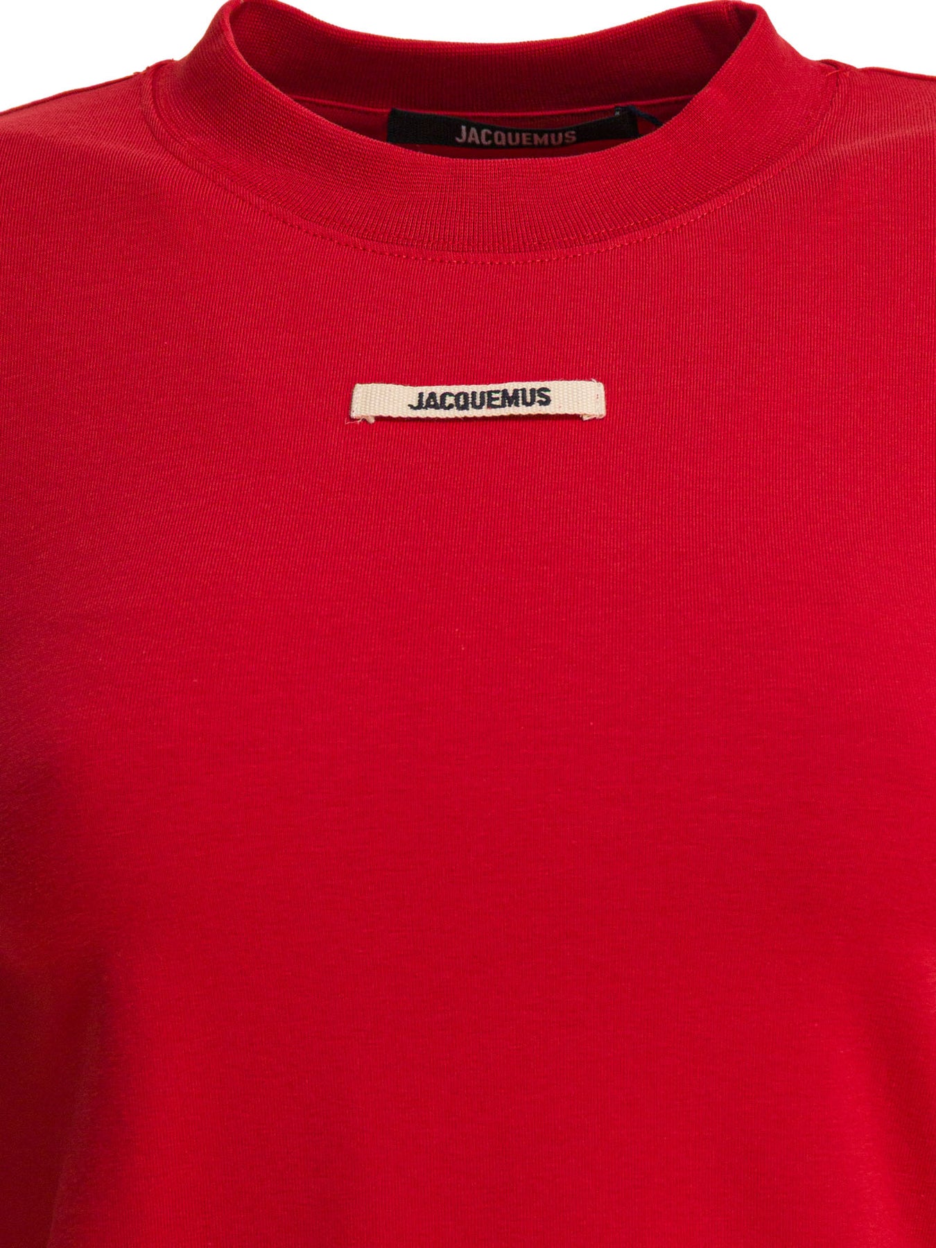Jacquemus "Gros Grain" long-sleeved T-shirt with fitted construction in stretch cotton. The main fabric, composed mainly of cotton with a percentage of elastane, gives elasticity and a compact structure. The essential silhouette features long sleeves and a ribbed crew neck. An embroidered grosgrain logo is applied to the chest, visible as a textural detail on the front surface. The finish features sharp edging and regular stitching. || - Gros-grain logo embroidered on the chest - Long sleeves - Stretch cotton - Ribbed crew neck - Cropped fit
