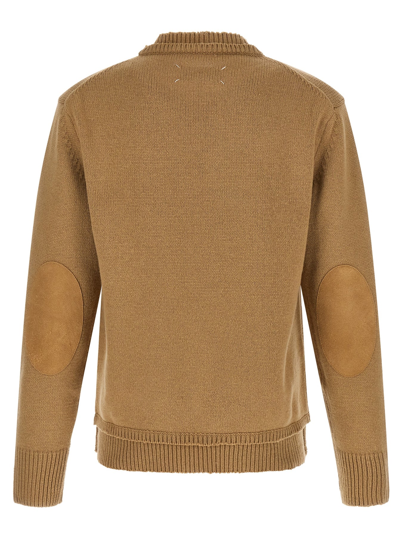 Thick knit wool sweater, crew neck, double layer effect, destroyed details, suede patches on the sleeves, long sleeves with cuffs.