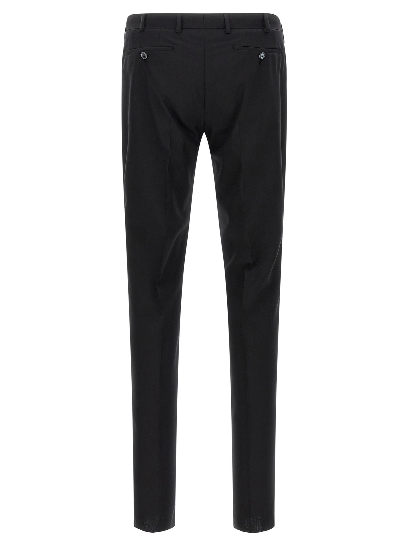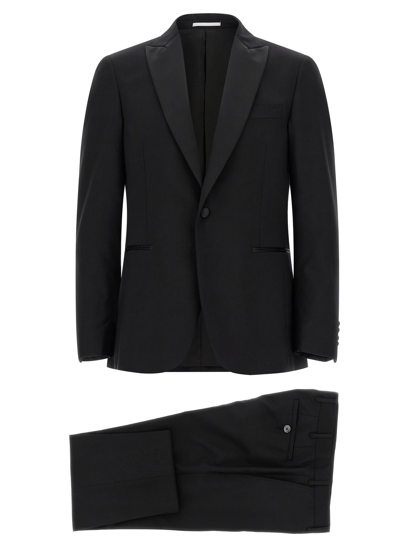 'linea Cerimonia' wool dress consisting of single-breasted blazer with single button closure, tonal satin details, peak lapels, breast pocket, patch pockets, viscose lining, two inner pockets, buttonhole cuffs, back slits and trousers with stretched pleat, front pockets americane", back welt pockets, front zip and button closure, viscose lining.