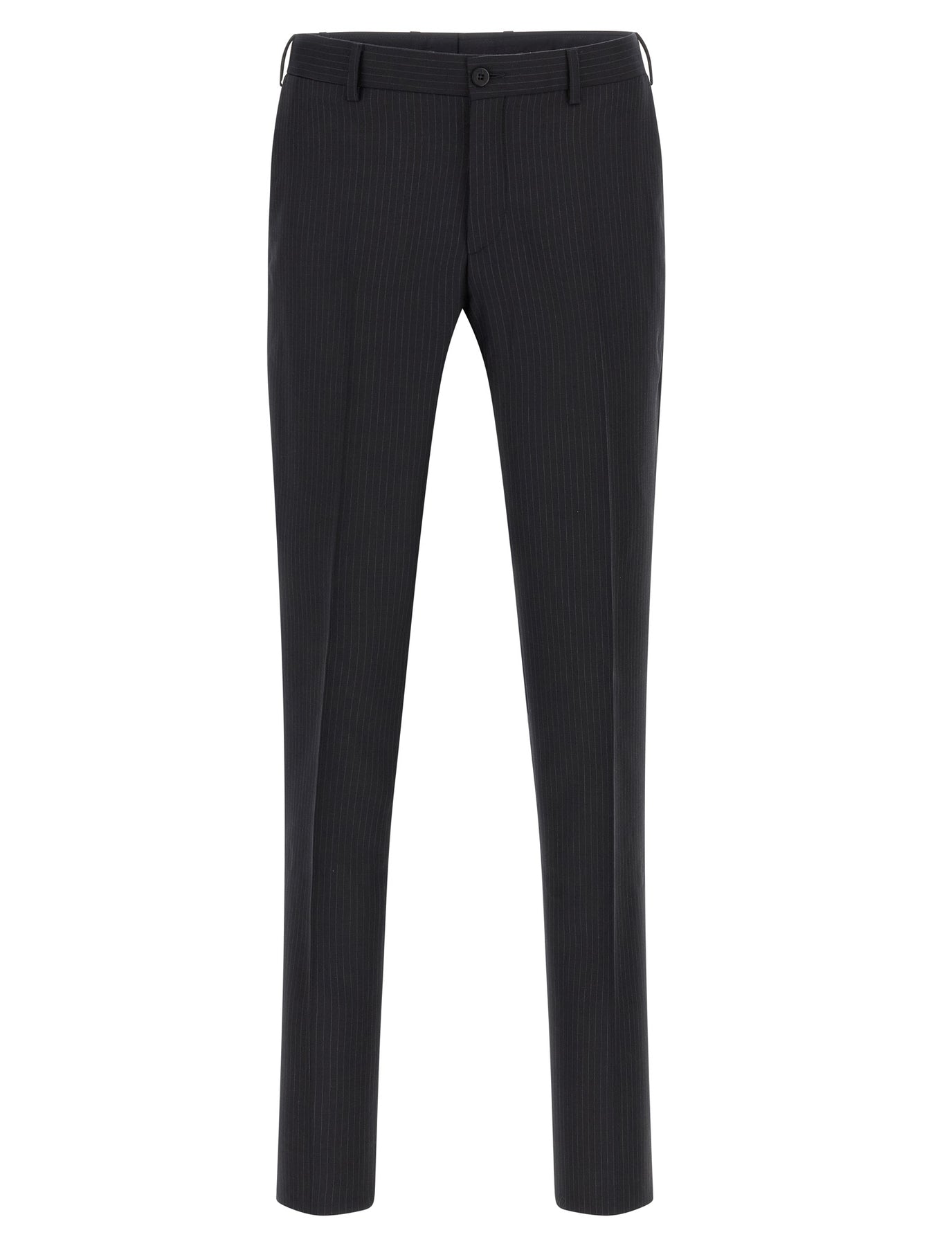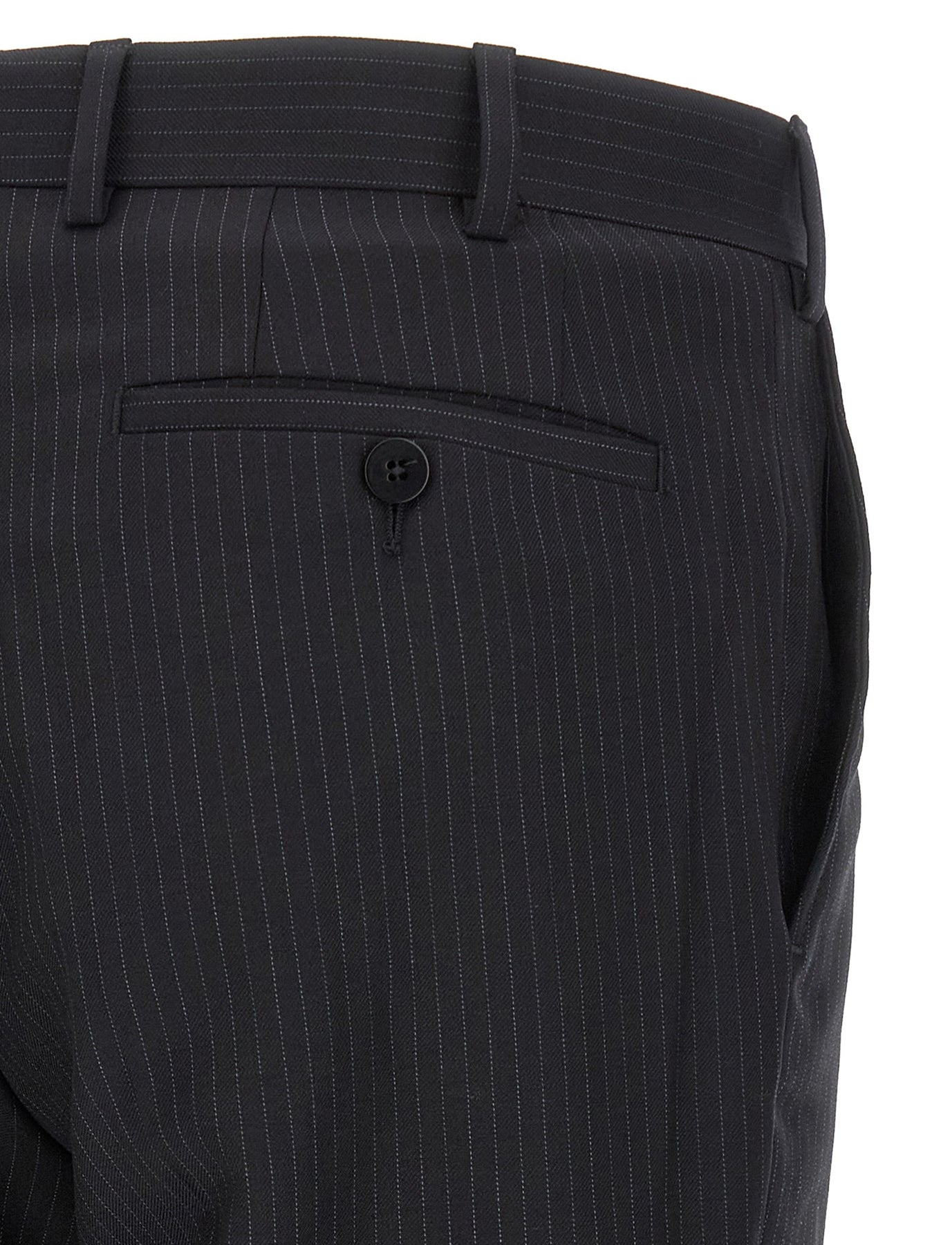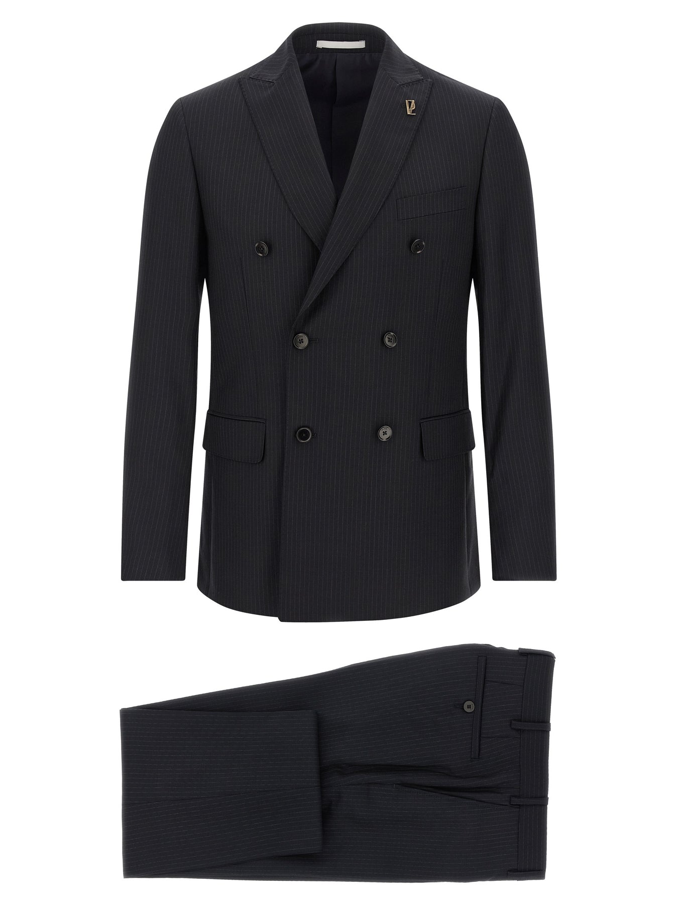 'Lord' pinstripe patterned wool dress consisting of double-breasted blazer with front button closure, peak lapels with removable metal brooch, breast pocket, flap pockets, cupro lining, two inner pockets, structured shoulder strap, cuffs with opening buttonholes, back slits and trousers with stretched pleat, front pockets 'americane', back welt pockets, front zip and button closure, viscose lining.
