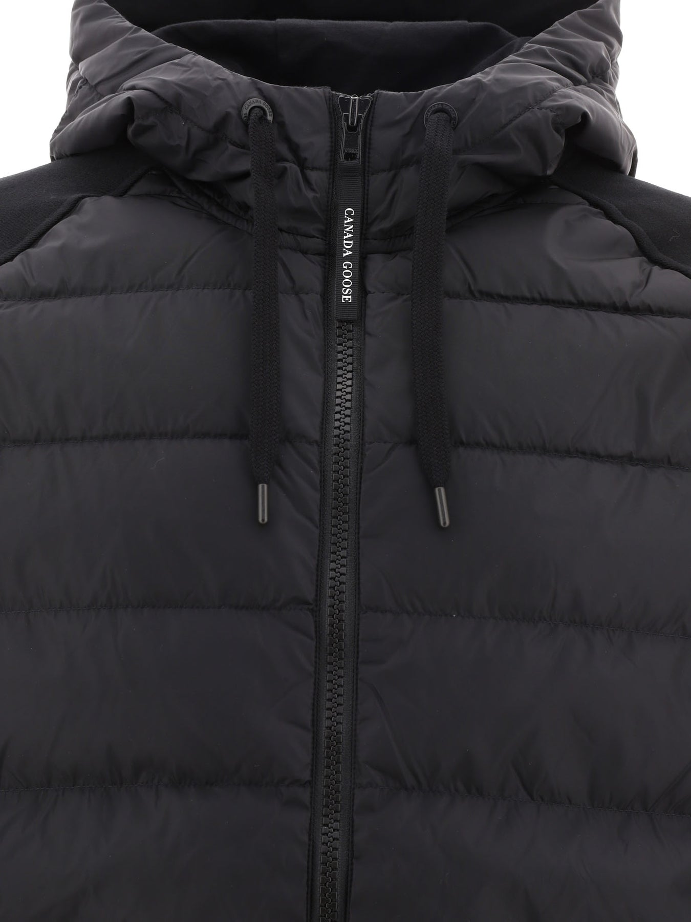 Canada Goose "Huron HyBridge" down jacket, made of brushed cotton terry, with smooth surfaces and softness on the inside. The structure includes padded panels distributed on the body and hood for added thermal protection, without increasing the overall weight. The silhouette features clean lines, with long sleeves and regular volume. Rib knit hems and cuffs contribute to heat containment. || - Applied logo - Long sleeves - Adjustable drawstring hood - Two zippered hand pockets - Hem and cuffs made of ribbed knit - Padded panels placed on body and hood - Main fabric: 100% cotton, brushed terry - Internal down and feather padding - Regular fit