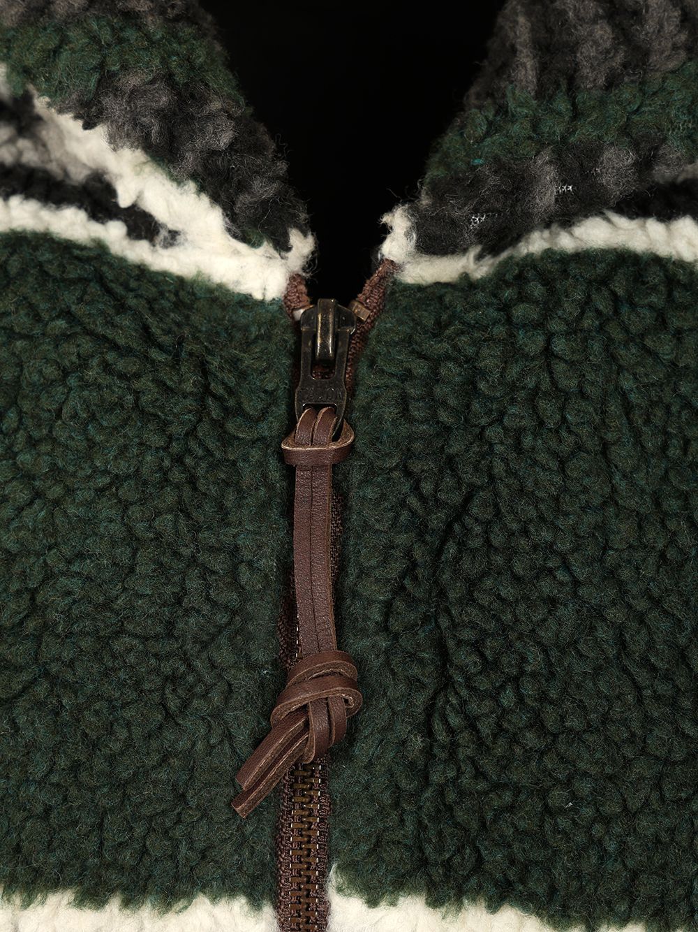Two-way zip fleece jacket with leather drawstring and leather logo patch on the left sleeve