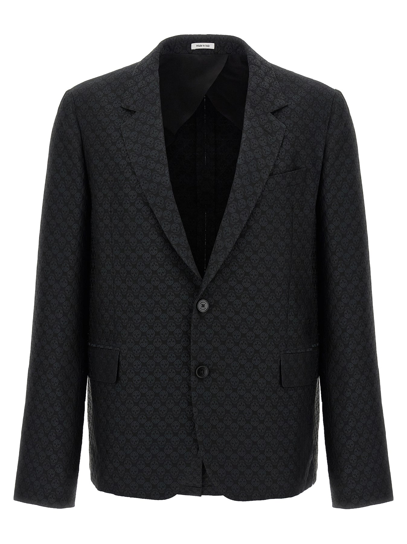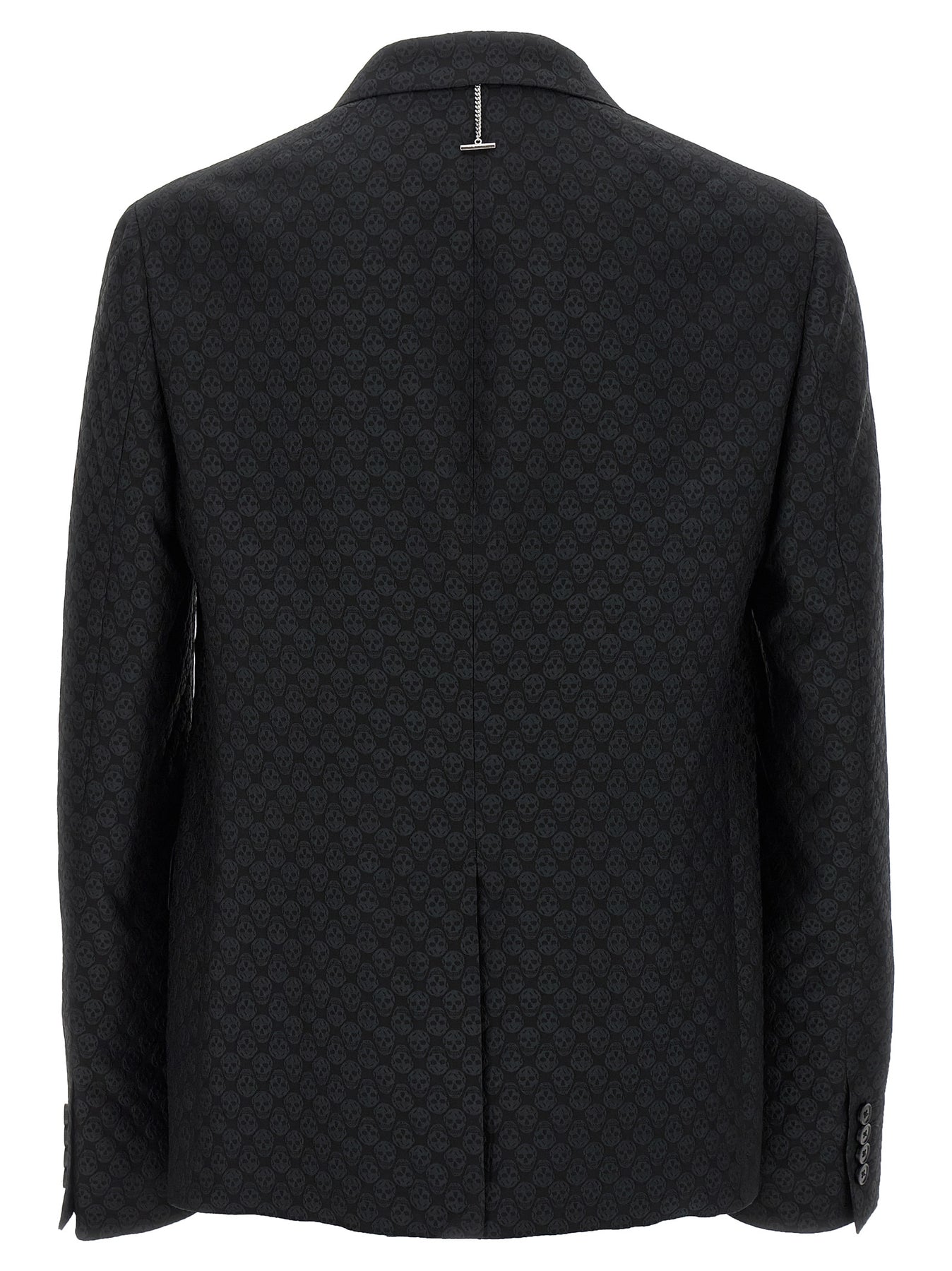Viscose blend blazer with all-over tone-on-tone jacquard 'Skull' pattern, deconstructed single-breasted model with two front button closure, mirror lapels, breast pocket, flap pockets, buttonhole cuffs, half lining, split and rear metal T-chain detail.