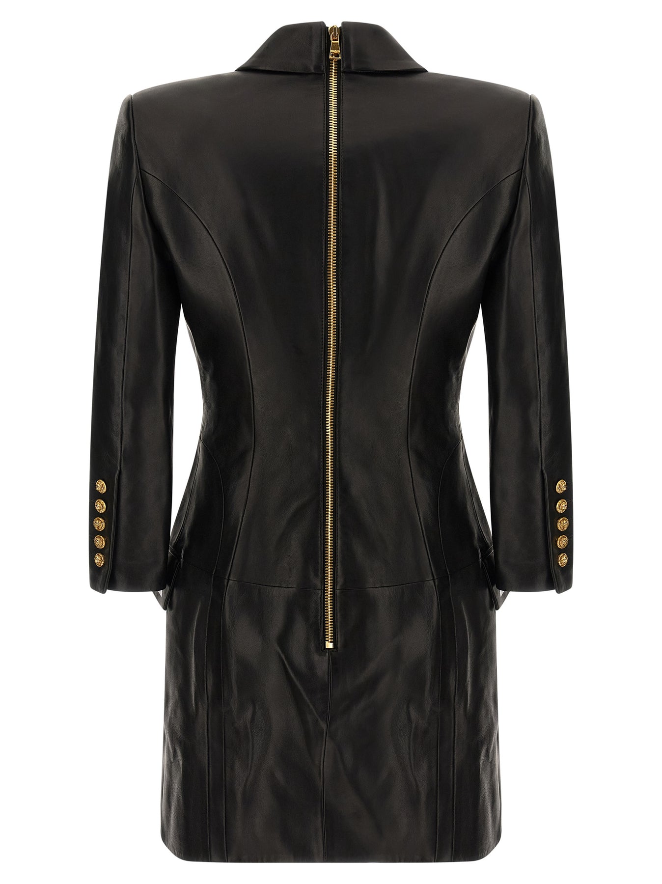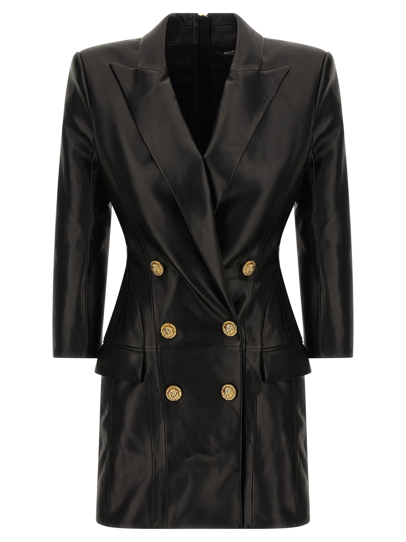 Leather mini dress with double-breasted blazer style, peak lapels, flap pockets, padded shoulder strap, long sleeves, and back zipper closure.