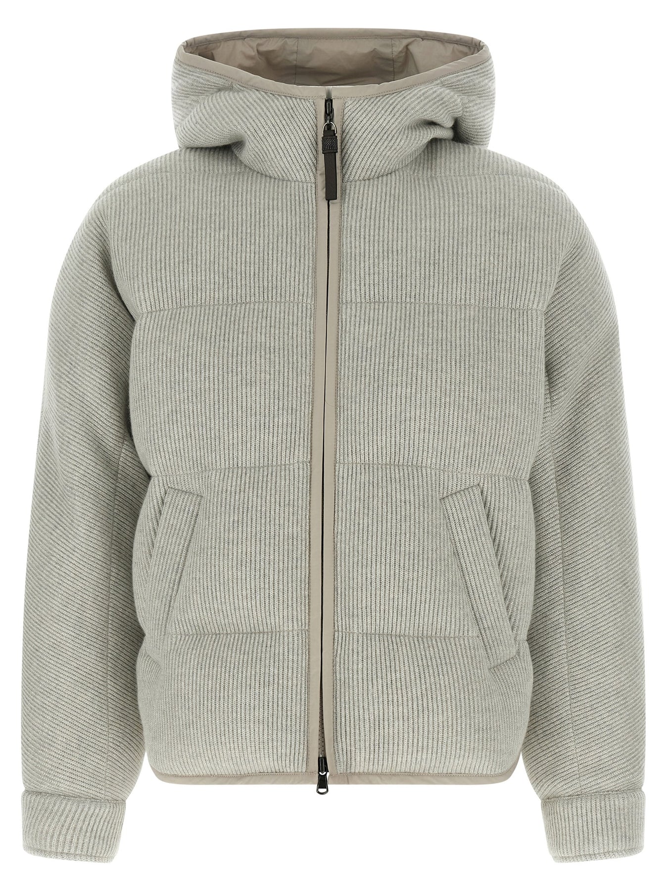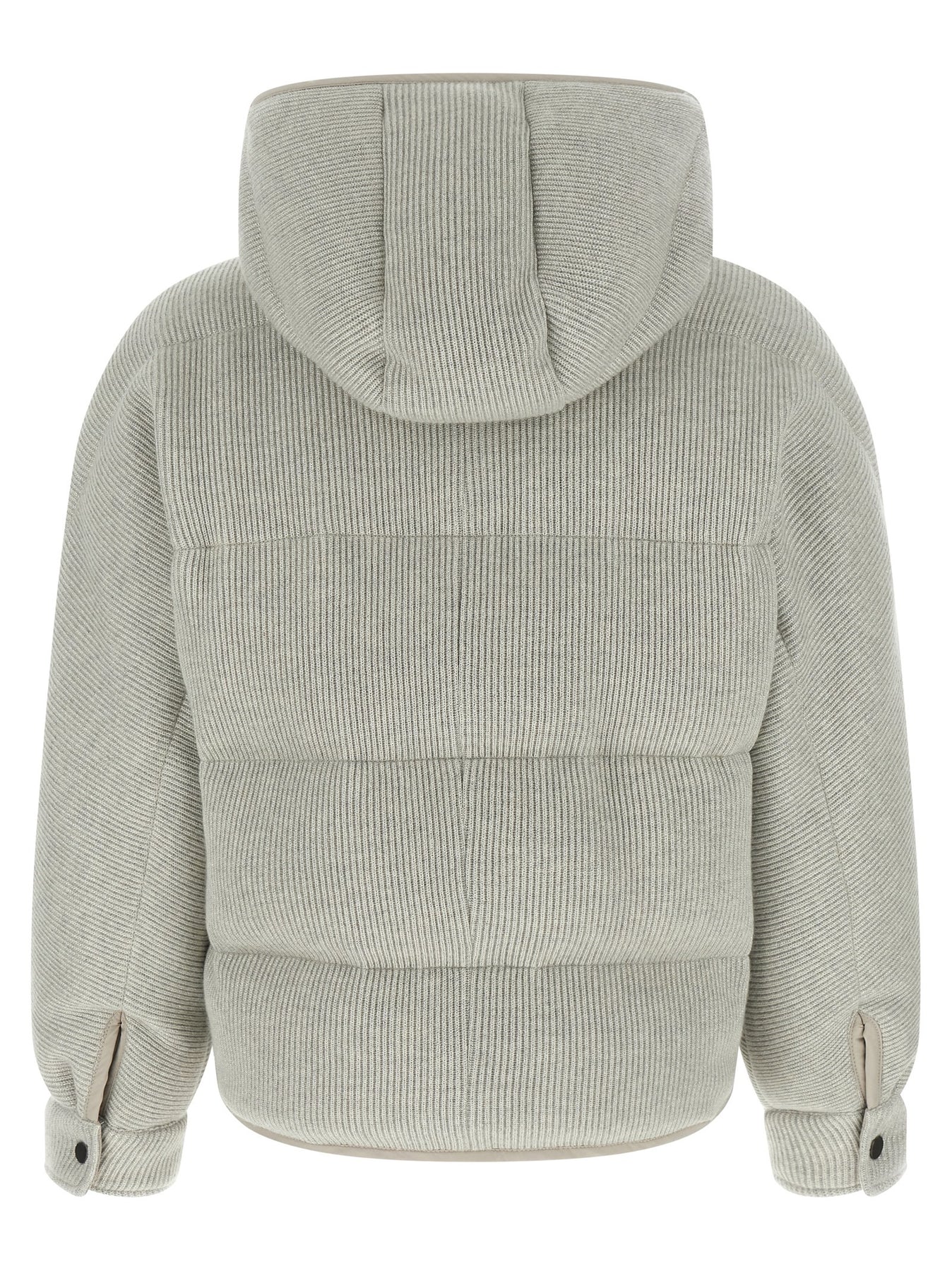Ribbed wool down jacket with lamé threads, quilted nylon lining with goose down padding, hood, high neck, front zip closure, pockets, long cuffed sleeves, side slits, asymmetrical hem.