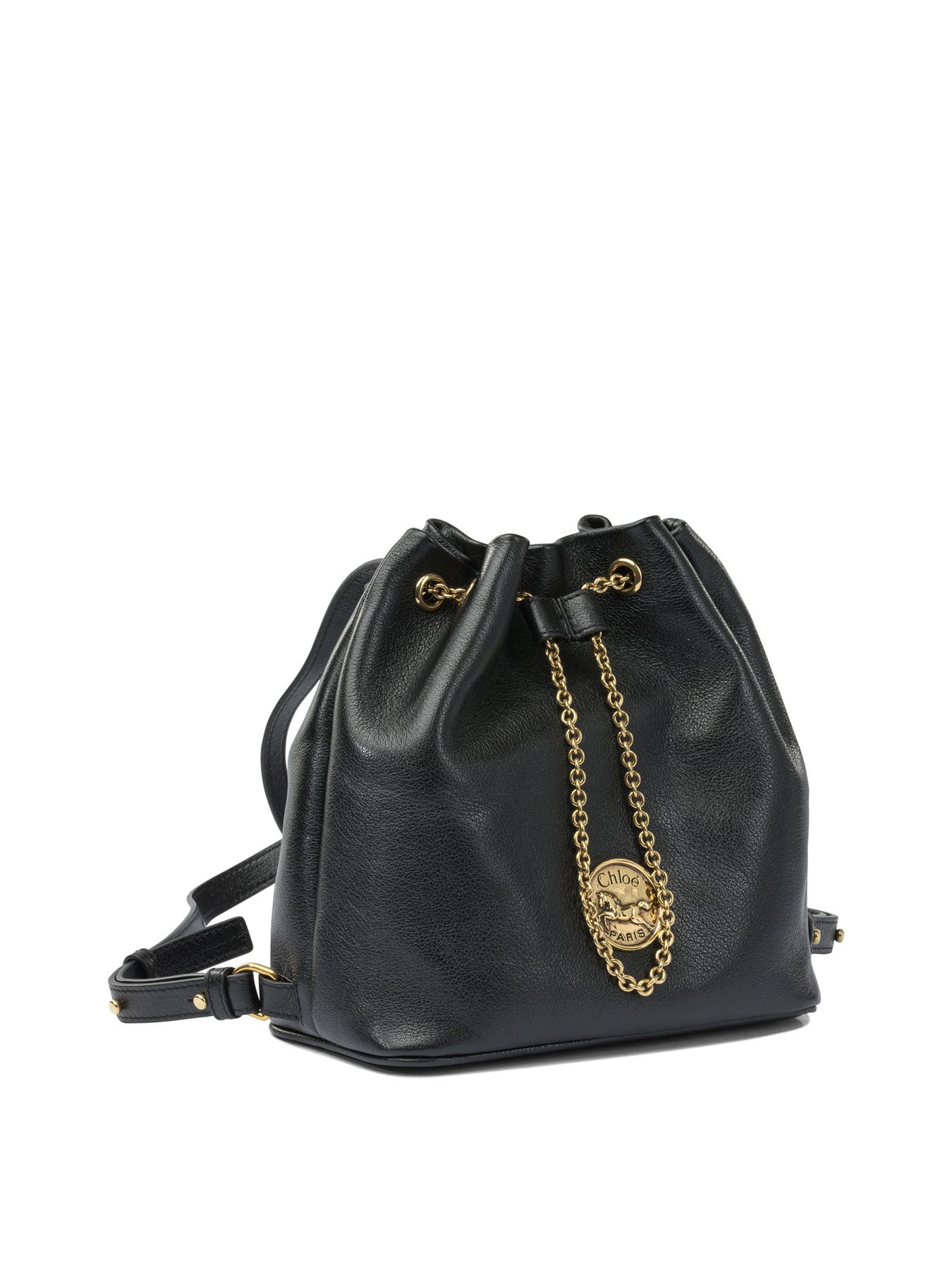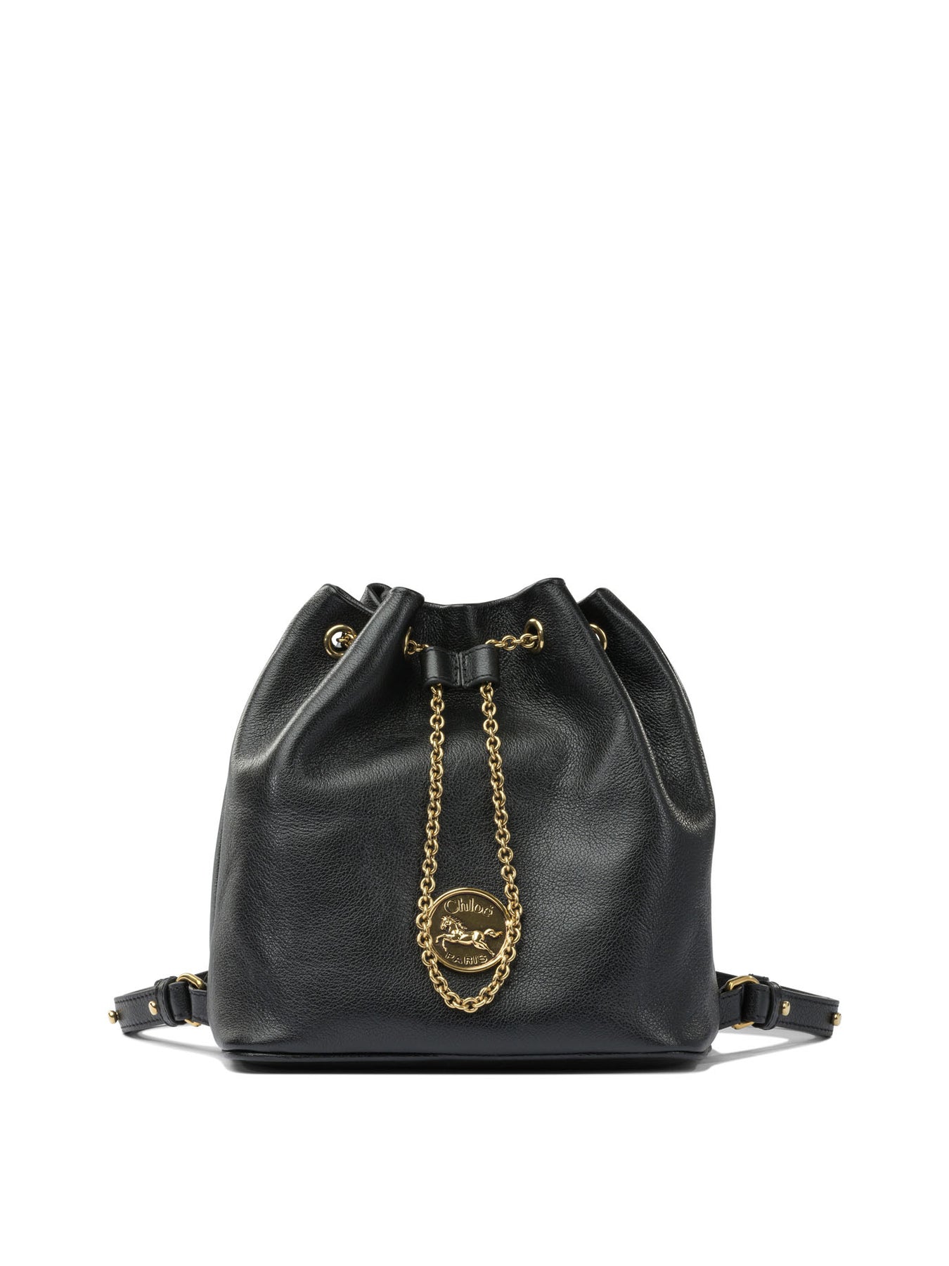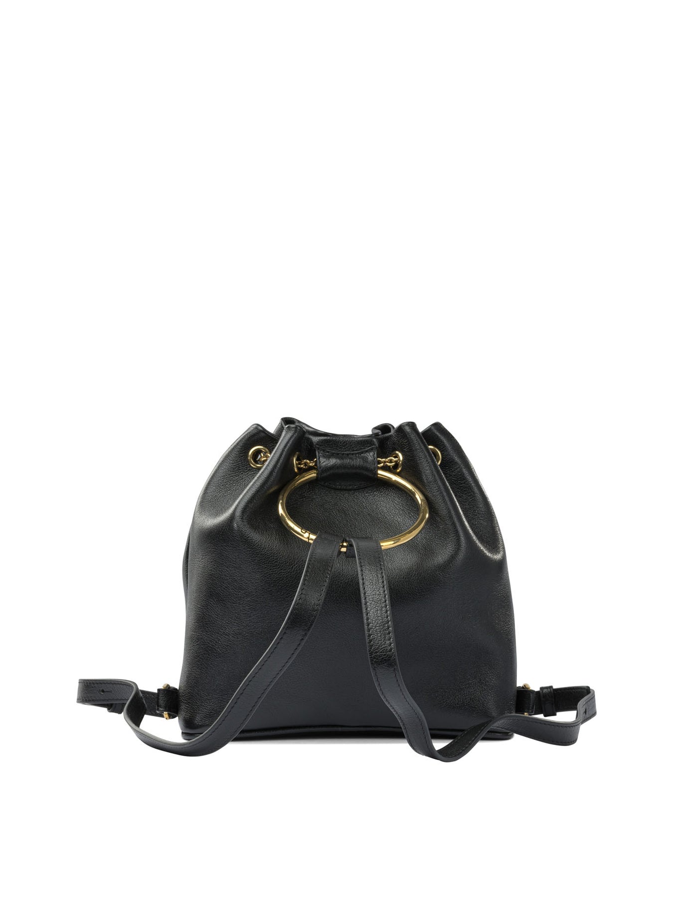 Chloé "Bracelet" backpack, crafted from garnet buffalo leather, features a compact, soft silhouette. An oversized metal bracelet handle, along with a chain drawstring closure, defines the upper structure. The Maison's emblematic Horse medal is inserted as a distinctive element on the surface. Adjustable and removable straps allow for different modes of carrying, either by hand or on the shoulder. || - Garnet buffalo leather - Oversize metal cuff handle - Top drawstring with metal chain - Iconic Horse medal applied - Adjustable and removable straps for hand or shoulder carry - Interior flat pockets - Top drawstring chain closure